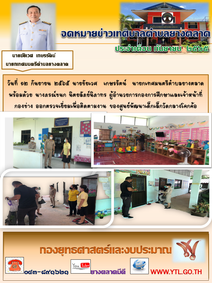 วันที่ ๑๒ กันยายน ๒๕๖๕ นายชัยเวศ เกษรรัตน์ นายกเทศมนตรีตำบลยางตลาดพร้อมด้วย นางภรณ์ชนก นิตยลัภย์นิภาทร ผู้อำนวยการกองการศึกษาและเจ้าหน้าที่กองช่าง ออกตรวจเยี่ยมเพื่อติดตามงาน... [12 กันยายน 2565]