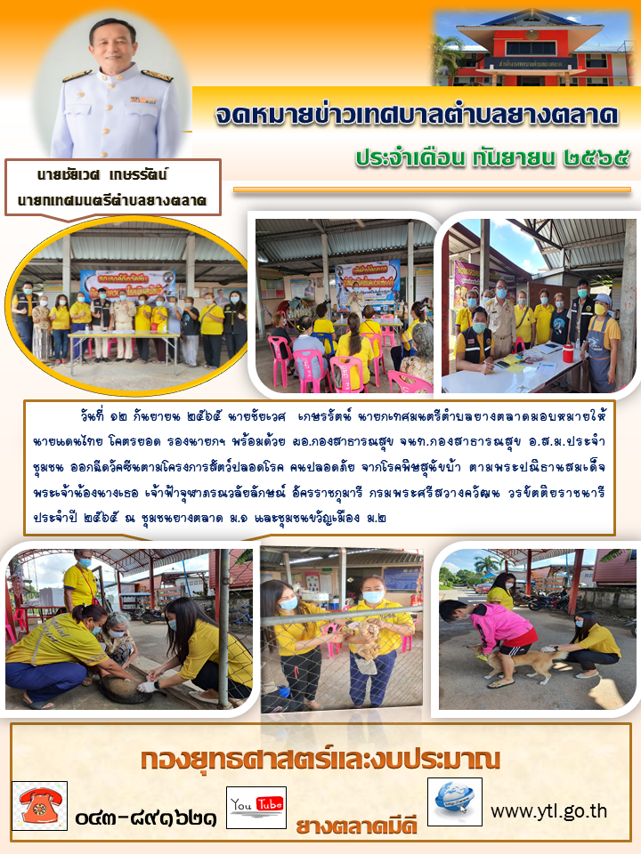 วันที่ ๑๙ กันยายน ๒๕๖๕ นายสุรชัย บัณฑิต รองนายกเทศมนตรีตำบลยางตลาดพร้อมด้วย สิบตำรวจเอกภูวดล ภูอาภรณ์ ปลัดเทศบาล ผอ.กองสาธารณสุข และเจ้าหน้าฯออกฉีดวัคชีนตามโครงการป้องกันและควบคุมโรคพิษสุนัขบ้า... [19 กันยายน 2565]