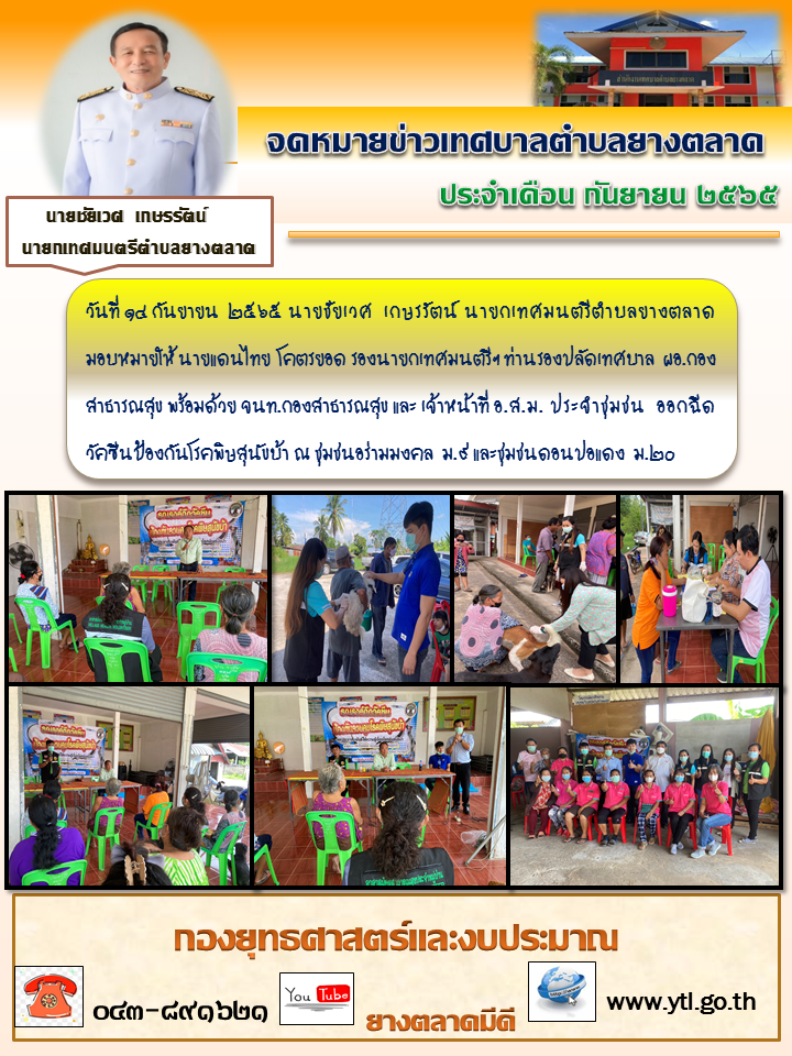 วันที่ ๑๔ กันยายน ๒๕๖๕ นายชัยเวศ เกษรรัตน์ นายกเทศมนตรีตำบลยางตลาด มอบหมายให้ นายแดนไทย โคตรยอด รองนายกเทศมนตรีฯ ท่านรองปลัดเทศบาล ผอ.กองสาธารณสุข พร้อมด้วย จนท.กองสาธารณสุข และ เจ้าหน้าที่ อ.ส.ม. ประจำชุมชน ... [14 กันยายน 2565]