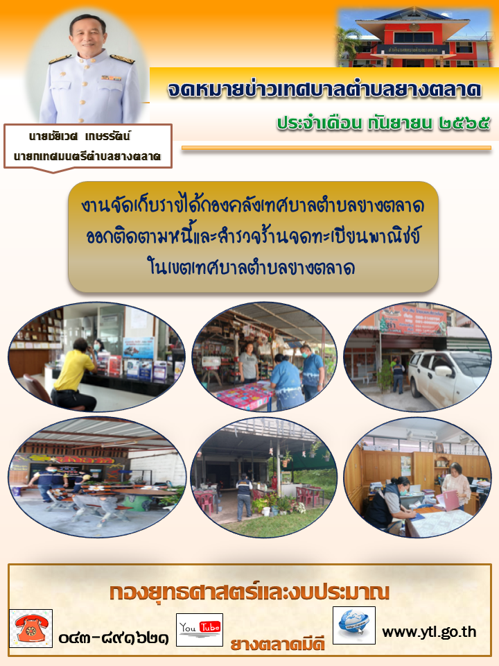 งานจัดเก็บรายได้กองคลังเทศบาลตำบลยางตลาดออกติดตามหนี้และสำรวจร้านจดทะเบียนพาณิชย์ในเขตเทศบาลตำบลยางตลาด [14 กันยายน 2565]