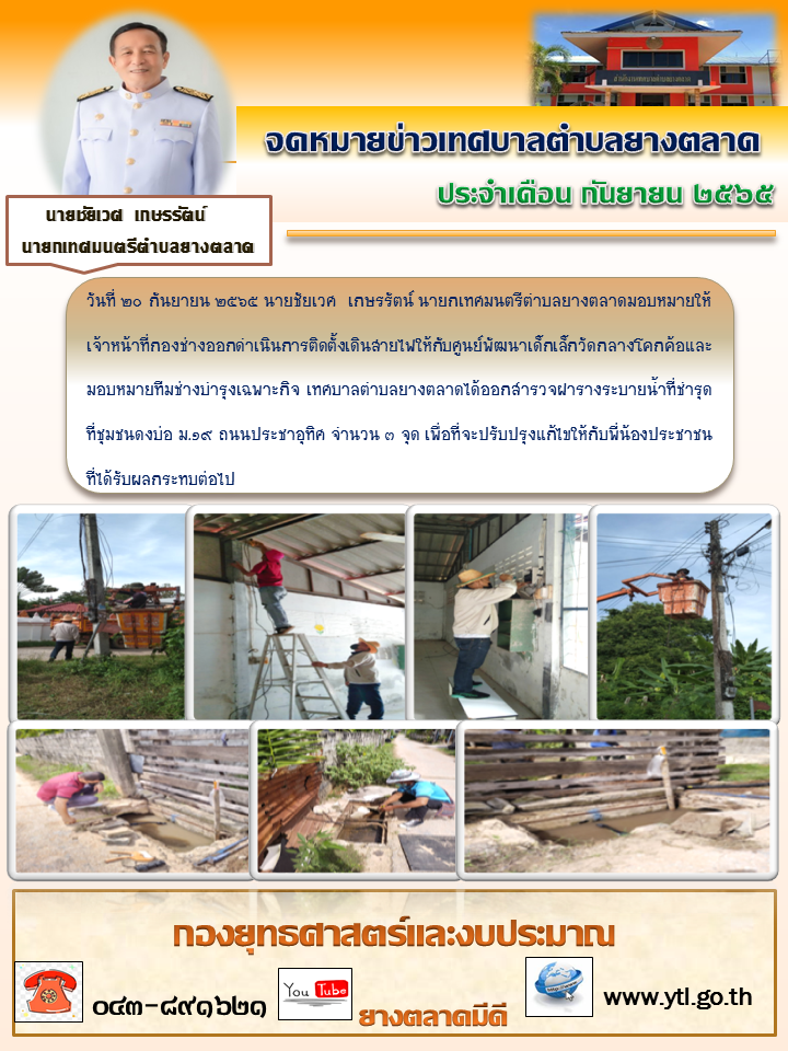 วันที่ ๒๐ กันยายน ๒๕๖๕ นายชัยเวศ เกษรรัตน์ นายกเทศมนตรีตำบลยางตลาดมอบหมายให้เจ้าหน้าที่กองช่างออกดำเนินการติดตั้้งเดินสายไฟให้กับศูนย์พัฒนาเด็กเล็กวัดกลางโคกค้อและมอบหมายทีมช่างบำรุงเฉพาะกิจ... [20 กันยายน 2565]