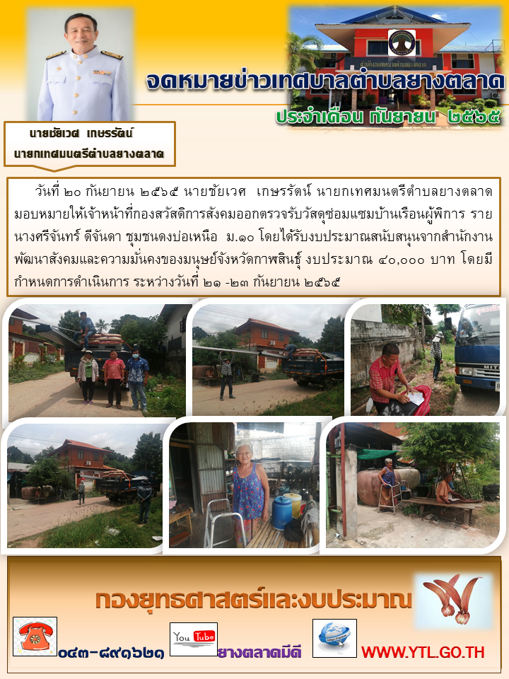 วันที่ ๒๐ กันยายน ๒๕๖๕ นายชัยเวศ เกษรรัตน์ นายกเทศมนตรีตำบลยางตลาดมอบหมายให้เจ้าหน้าที่กองสวัสดิการสังคมออกตรวจรับวัสดุซ่อมแซมบ้านเรือนผู้พิการ ราย นางศรีจันทร์ ดีจันดา ชุมชนดงบ่อเหนือ ม.๑๐... [20 กันยายน 2565]
