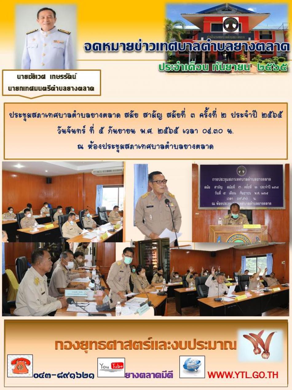 ประชุมสภาเทศบาลตำบลยางตลาด สมัย สามัญ สมัยที่ ๓ ครั้งที่ ๒ ประจำปี ๒๕๖๕ วันจันทร์ ที่ ๕ กันยายน พ.ศ. ๒๕๖๕ เวลา ๐๙.๓๐ น. ณ ห้องประชุมสภาเทศบาลตำบลยางตลาด [5 กันยายน 2565]