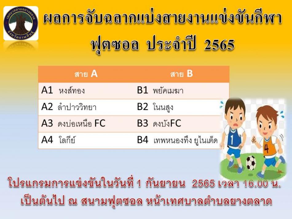 เทศบาลตำบลยางตลาดขอเชิญพี่น้องชาวยางตลาดร่วมชมและเชียร์ให้กำลังใจนักกีฬาในการแข่งขันกีฬาฟุตซอล ประจำปี 2565 ในวันที่ 1 กันยายน 2565 เวลา 16.00 เป็นต้นไป ณ สนามฟุตซอล หน้าเทศบาลตำบลยางตลาด [30 สิงหาคม 2565]