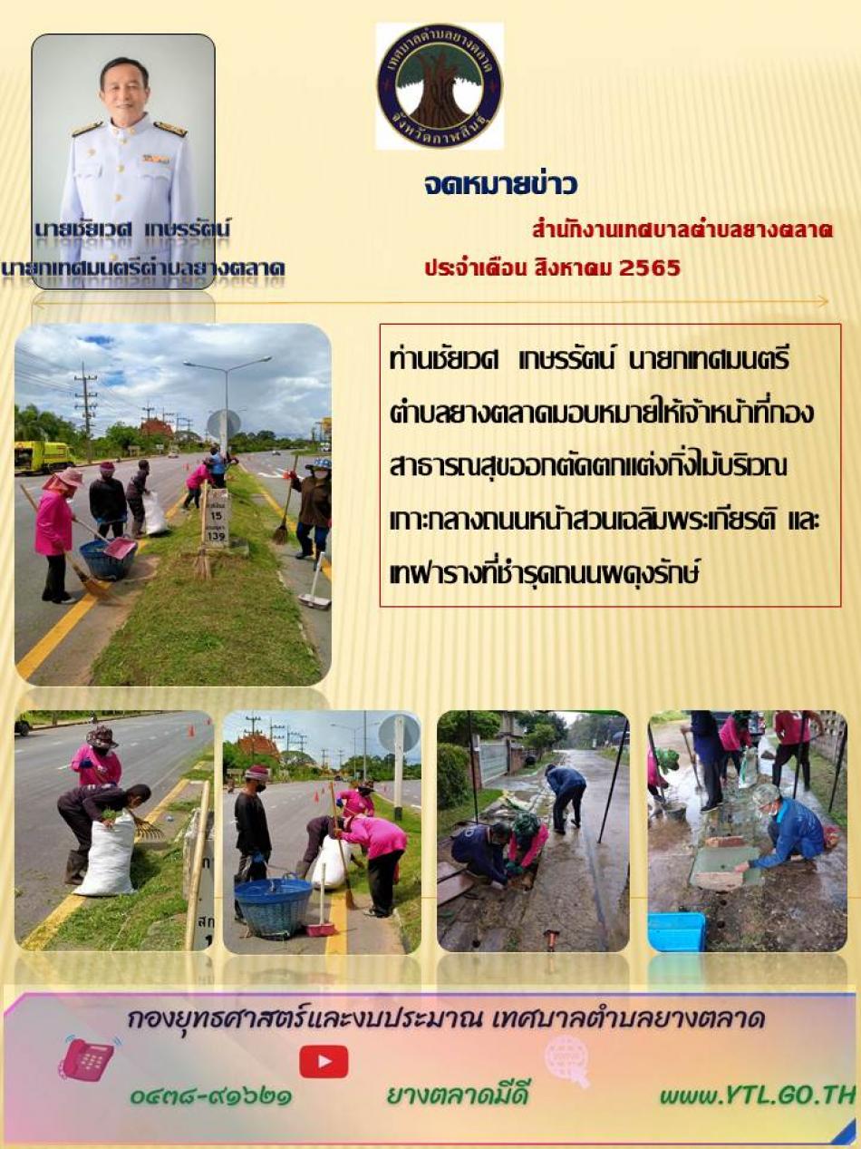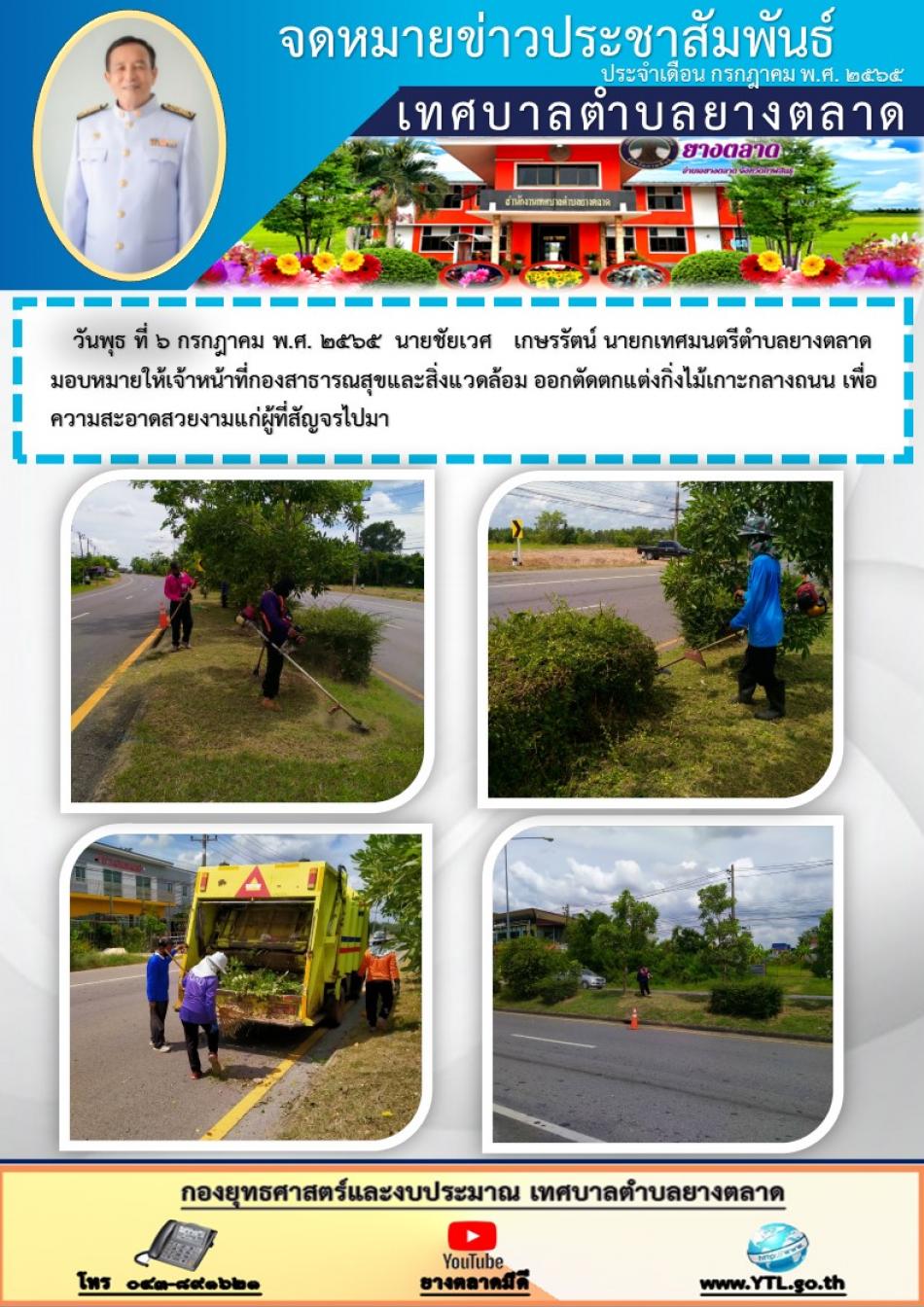ท่านชัยเวศ เกษรรัตน์ นายกเทศมนตรีตำบลยางตลาดมอบหมายให้เจ้าหน้าที่กองสาธารณสุขออกตัดตกแต่งกิ่งไม้บริเวณเกาะกลางถนนหน้าสวนเฉลิมพระเกียรติ และ เทฝารางที่ชำรุดถนนผดุงรักษ์ [2 สิงหาคม 2565]