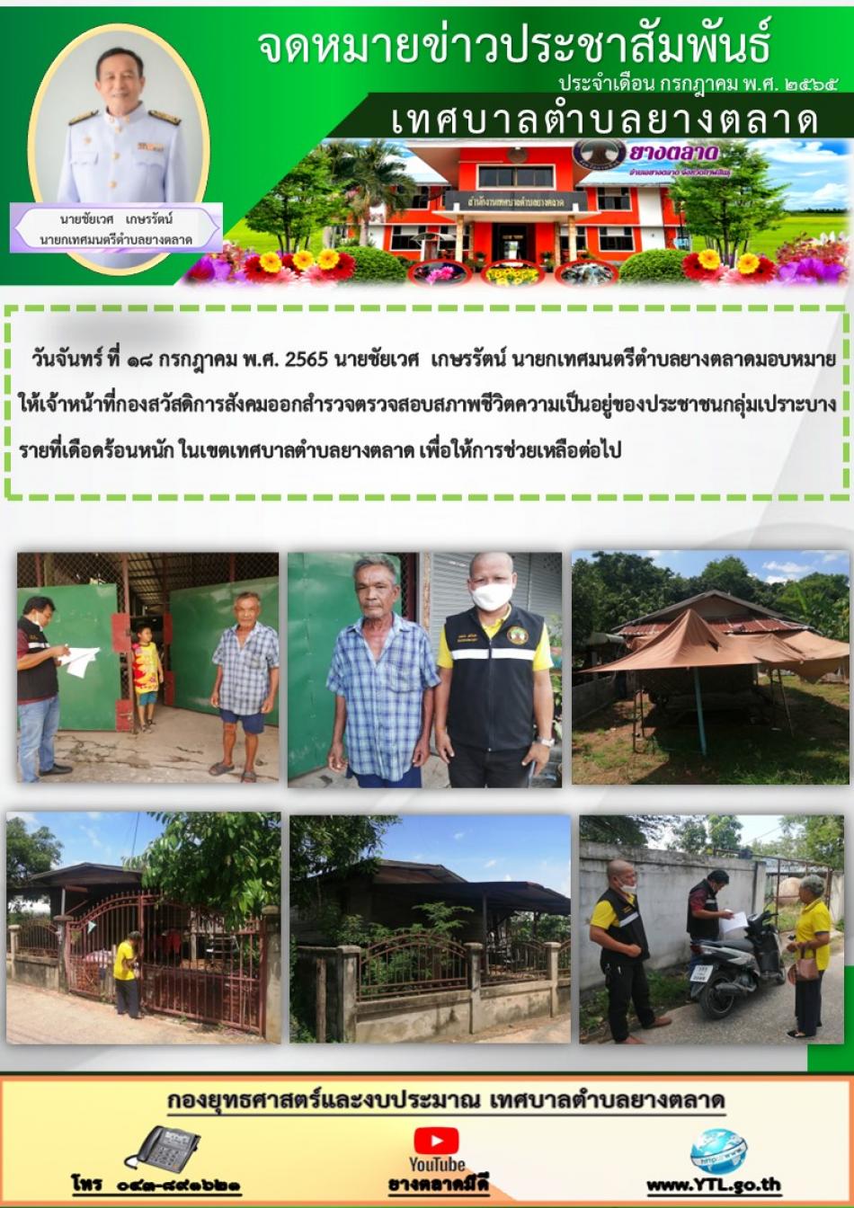 กองสวัสดิการสังคมออกสำรวจตรวจสอบสภาพชีวิตความเป็นอยู่ของประชาชน กลุ่มเปราะบางในเขตเทศบาลตำบลยางตลาด [18 กรกฎาคม 2565]