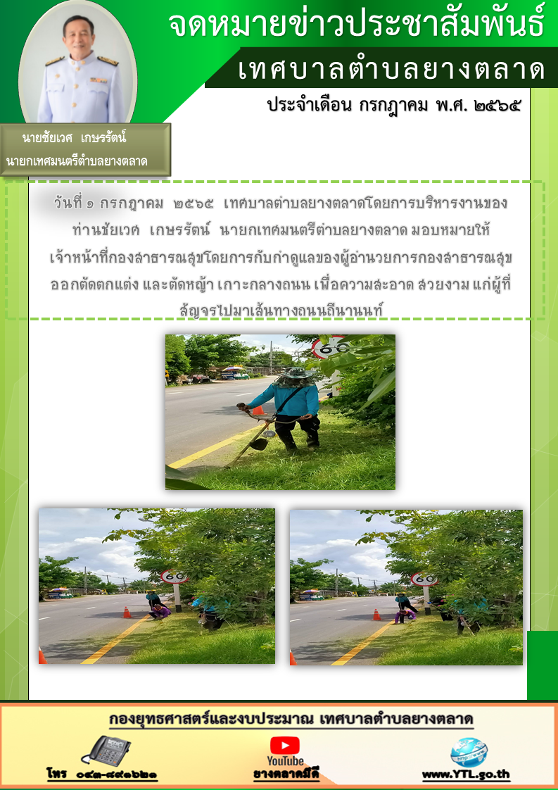 วันที่ ๑ กรกฎาคม ๒๕๖๕ เทศบาลตำบลยางตลาดโดยการบริหารงานของท่านชัยเวศ เกษรรัตน์ นายกเทศมนตรีตำบลยางตลาด มอบหมายให้เจ้าหน้าที่กองสาธารณสุขโดยการกับกำดูแลของผู้อำนวยการกองสาธารณสุขออกตัดตกแต่ง และตัดหญ้า... [1 กรกฎาคม 2565]