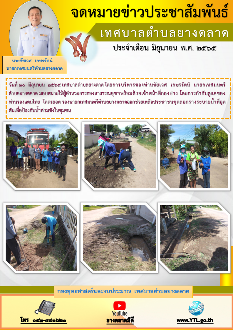 วันที่ ๓๐ มิถุนายน ๒๕๖๕ เทศบาลตำบลยางตาด โดยการบริหารของท่านชัยเวศ เกษรรัตน์ นายกเทศมนตรีตำบลยางตลาด มอบหมายให้ผู้อำนวยการกองสาธารณสุขฯพร้อมด้วยเจ้าหน้าที่กองช่าง โดยการกำกับดูแลของท่านรองแดนไทย โคตรยอด... [30 มิถุนายน 2565]