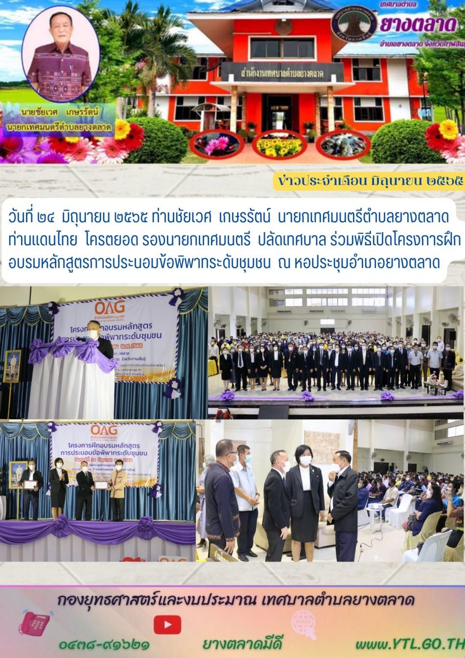 วันที่ ๒๔ มิถุนายน ๒๕๖๕ ท่านชัยเวศ เกษรรัตน์ นายกเทศมนตรีตำบลยางตลาด ท่านแดนไทย โครตยอด รองนายกเทศมนตรี ปลัดเทศบาล ร่วมพิธีเปิดโครงการฝึกอบรมหลักสูตรการประนอมข้อพิพาทระดับชุมชน ณ หอประชุมอำเภอยางตลาด [24 มิถุนายน 2565]