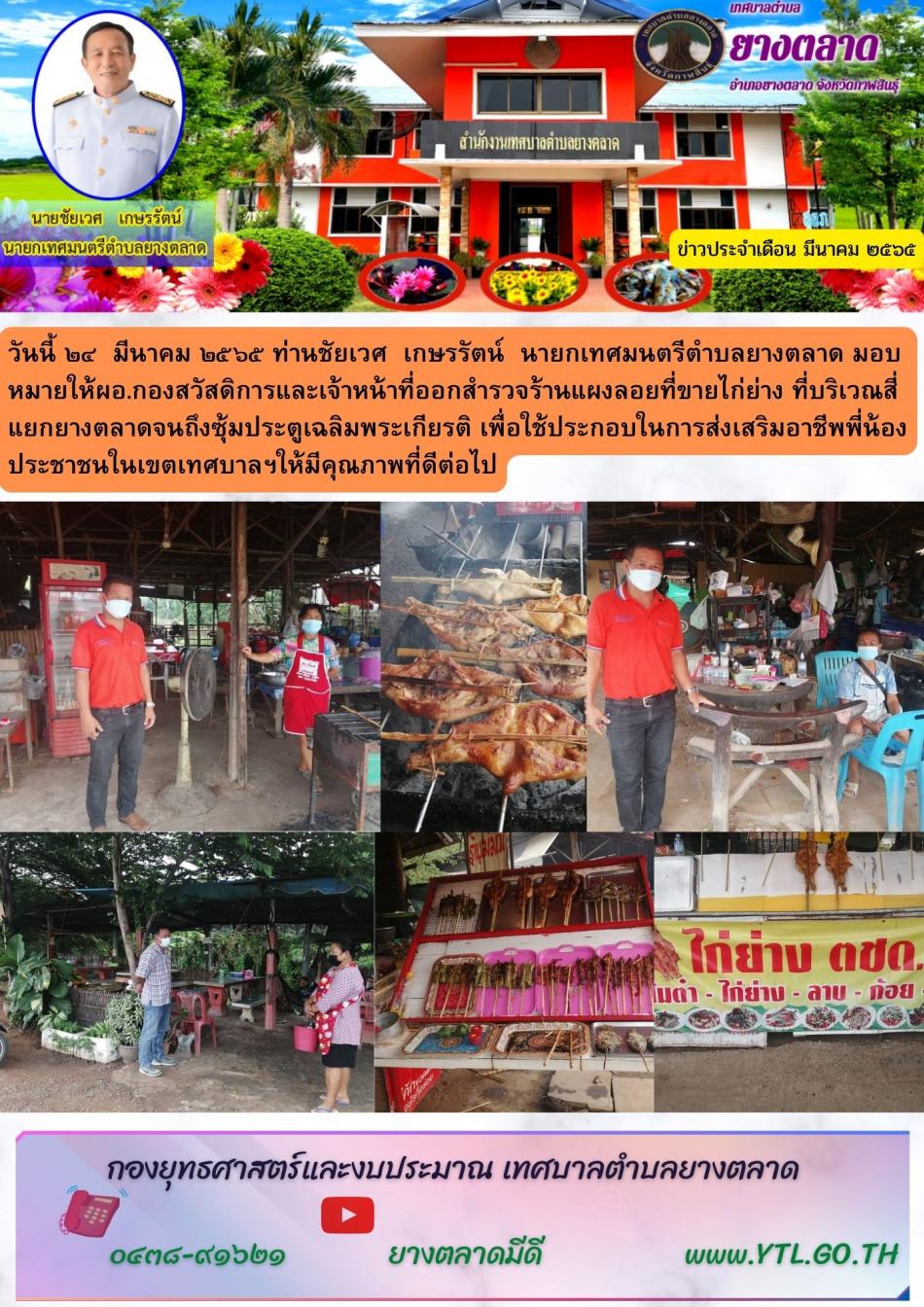 วันนี้ ๒๔ มีนาคม ๒๕๖๕ ท่านชัยเวศ เกษรรัตน์ นายกเทศมนตรีตำบลยางตลาด มอบหมายให้ผอ.กองสวัสดิการและเจ้าหน้าที่ออกสำรวจร้านแผงลอยที่ขายไก่ย่าง ที่บริเวณสี่แยกยางตลาดจนถึงซุ้มประตูเฉลิมพระเกียรติ... [24 มีนาคม 2565]