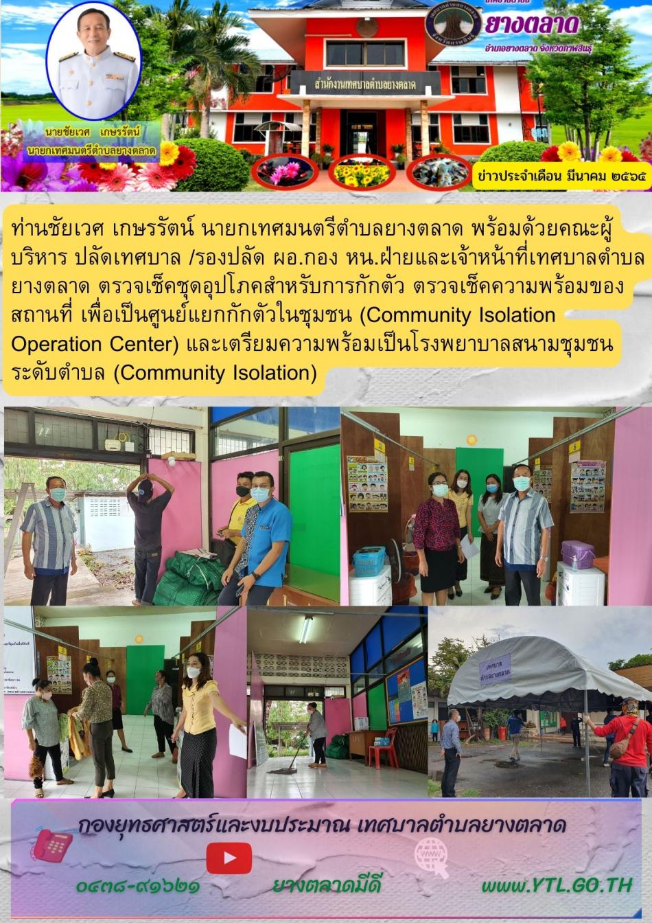 ท่านชัยเวศ เกษรรัตน์ นายกเทศมนตรีตำบลยางตลาด พร้อมด้วยคณะผู้บริหาร ปลัดเทศบาล /รองปลัด ผอ.กอง หน.ฝ่ายและเจ้าหน้าที่เทศบาลตำบลยางตลาด ตรวจเช็คชุดอุปโภคสำหรับการกักตัว ตรวจเช็คความพร้อมของสถานที่... [23 มีนาคม 2565]