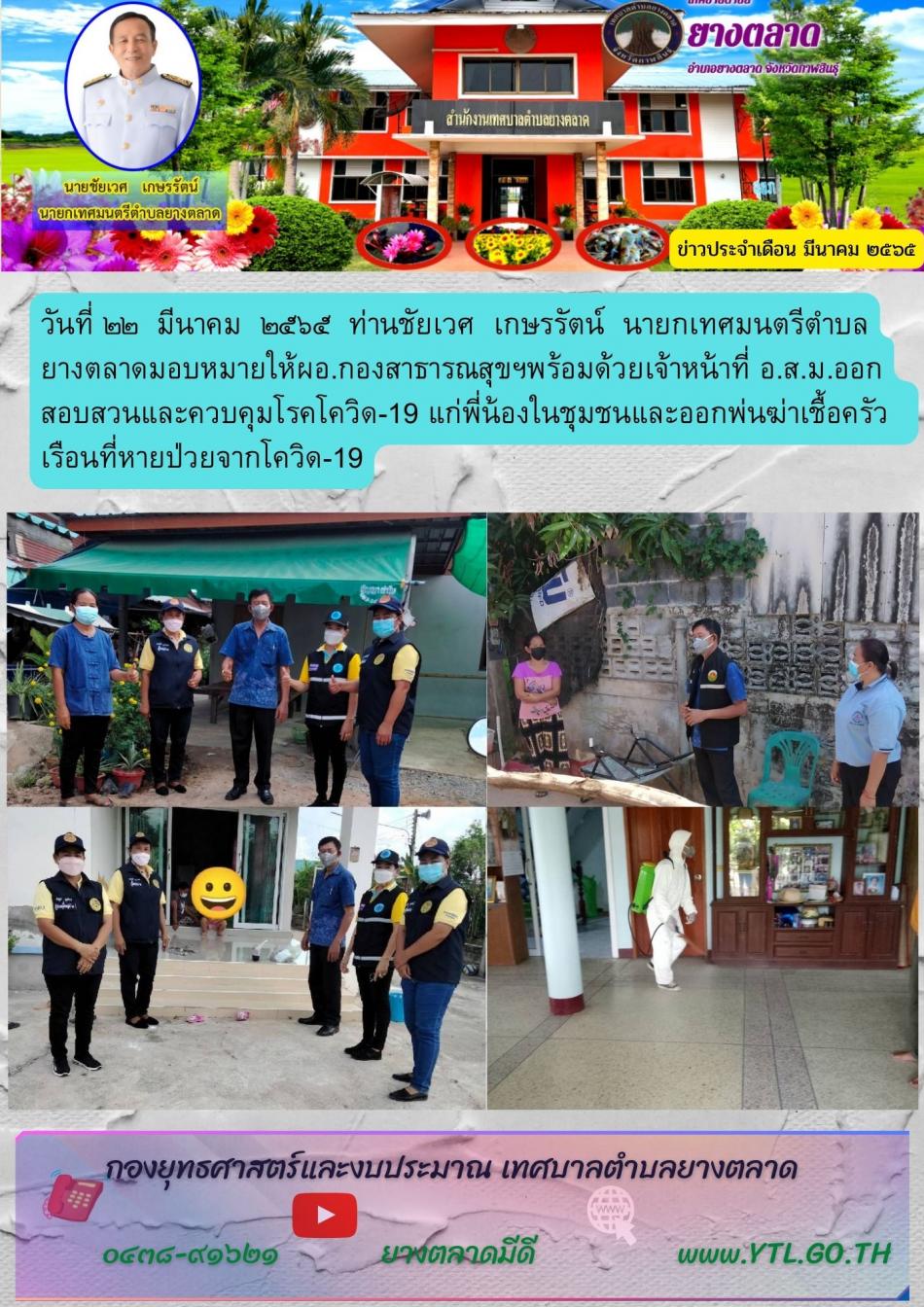 วันที่ ๒๒ มีนาคม ๒๕๖๕ ท่านชัยเวศ เกษรรัตน์ นายกเทศมนตรีตำบลยางตลาดมอบหมายให้ผอ.กองสาธารณสุขฯพร้อมด้วยเจ้าหน้าที่ อ.ส.ม.ออกสอบสวนและควบคุมโรคโควิด-19 แก่พี่น้องในชุมชนและออกพ่นฆ่าเชื้อครัว ... [22 มีนาคม 2565]