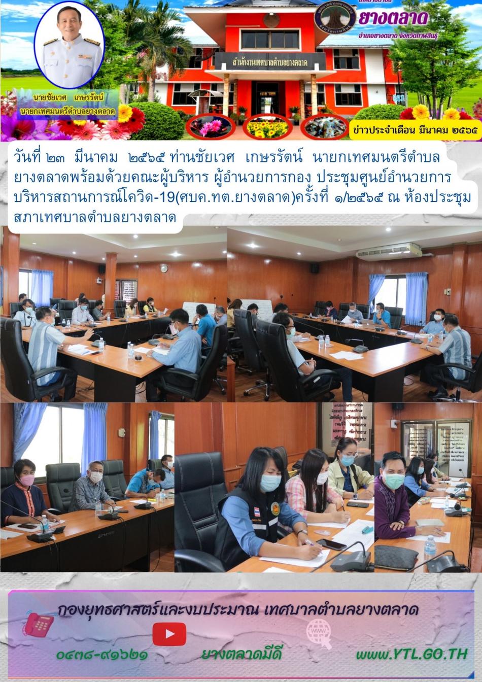 วันที่ ๒๓ มีนาคม ๒๕๖๕ ท่านชัยเวศ เกษรรัตน์ นายกเทศมนตรีตำบลยางตลาดพร้อมด้วยคณะผู้บริหาร ผู้อำนวยการกอง ประชุมศูนย์อำนวยการบริหารสถานการณ์โควิด-19(ศบค.ทต.ยางตลาด)ครั้งที่ ๑/๒๕๖๕ ณ ห้องประชุมสภาเทศบาลตำบลยางตลาด [23 มีนาคม 2565]