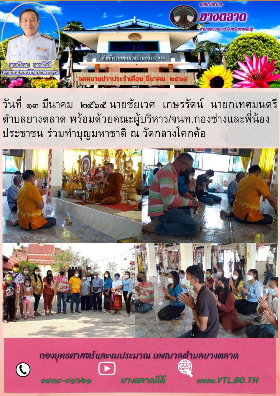วันที่ ๑๓ มีนาคม ๒๕๖๕ นายชัยเวศ เกษรรัตน์ นายกเทศมนตรีตำบลยางตลาด พร้อมด้วยคณะผู้บริหาร/จนท.กองช่างและพี่น้องประชาชน ร่วมทำบุญมหาชาติ ณ วัดกลางโคกค้อ [13 มีนาคม 2565]