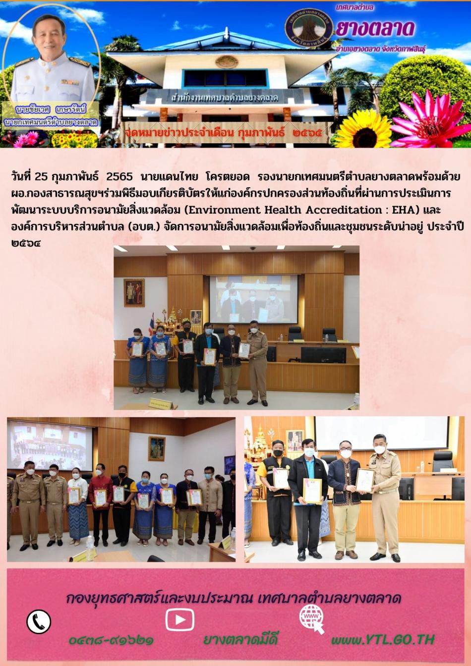 วันที่ 25 กุมภาพันธ์ 2565 นายแดนไทย โครตยอด รองนายกเทศมนตรีตำบลยางตลาดพร้อมด้วย ผอ.กอสาธารณสุขร่วมพิธีมอบเกียรติบัติให้แก่องค์กรปกครองส่วนท้องถิ่นที่ผ่านการประเมินการพัฒนาระบบการอนามัยสิ่งแวดล้อม [25 กุมภาพันธ์ 2565]