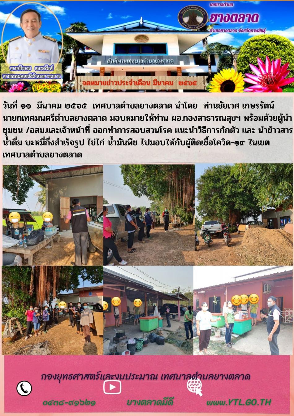 วันศุกร์ ที่ ๔ มีนาคม ๒๕๖๕ เวลา ๑๐.๐๐ -๑๒.๓๐ น. เทศบาลตำบลยางตลาด โดยการบริหารงานของท่านชัยเวศ เกษรรัตน์ นายกเทศมนตรีตำบลยางตลาด ร่วมกับ ผู้ใหญ่บ้าน อสม. มีความห่วงใยสำหรับผู้ติดเชื้อโควิด -๑๙... [4 มีนาคม 2565]