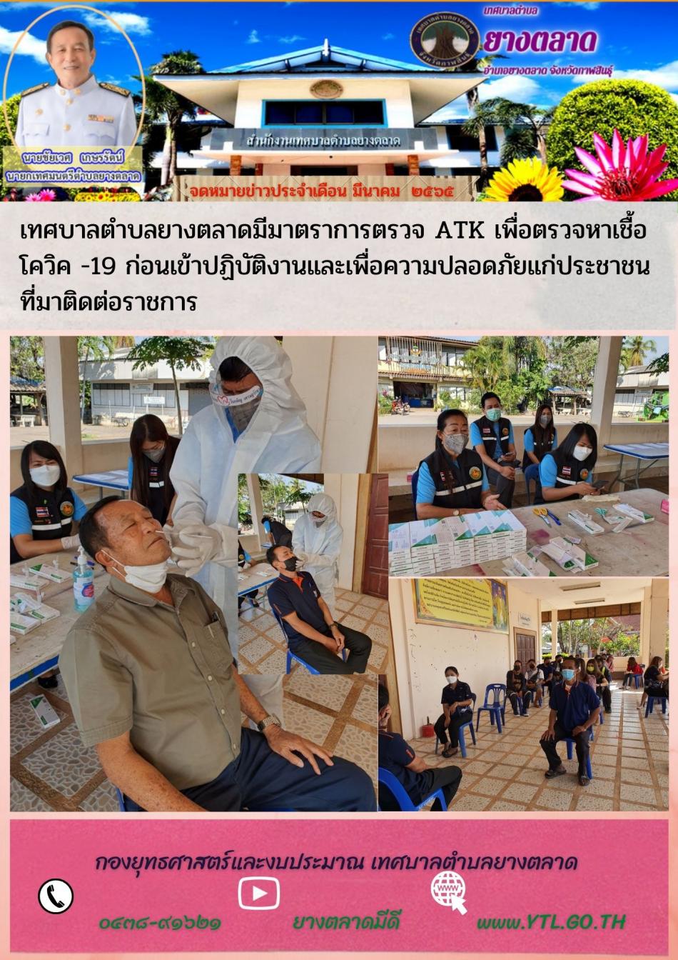 เทศบาลตำบลยางตลาดมีมาตราการตรวจ ATK เพื่อตรวจหาเชื้อโควิด -19 เพื่อความปลอดภัยแก่ประชาชนที่เดินทางมาติดต่อราชการ [3 มีนาคม 2565]