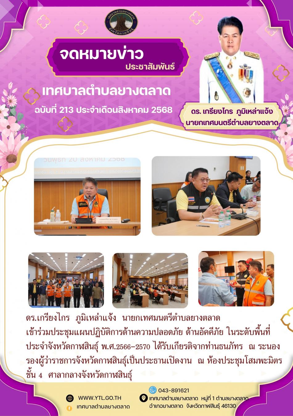 ดร.เกรียงไกร ภูมิเหล่าแจ้ง นายกเทศมนตรีตำบลยางตลาด เข้าร่วมประชุมแผนปฏิบัติการด้านความปลอดภัย ด้านอัคคีภัย ในระดับพื้นที่ประจำจังหวัดกาฬสินธุ์ พ.ศ.2566-2570 ได้รับเกียรติจาก ท่านธนภัทร ณ ระนอง... [20 สิงหาคม 2568]