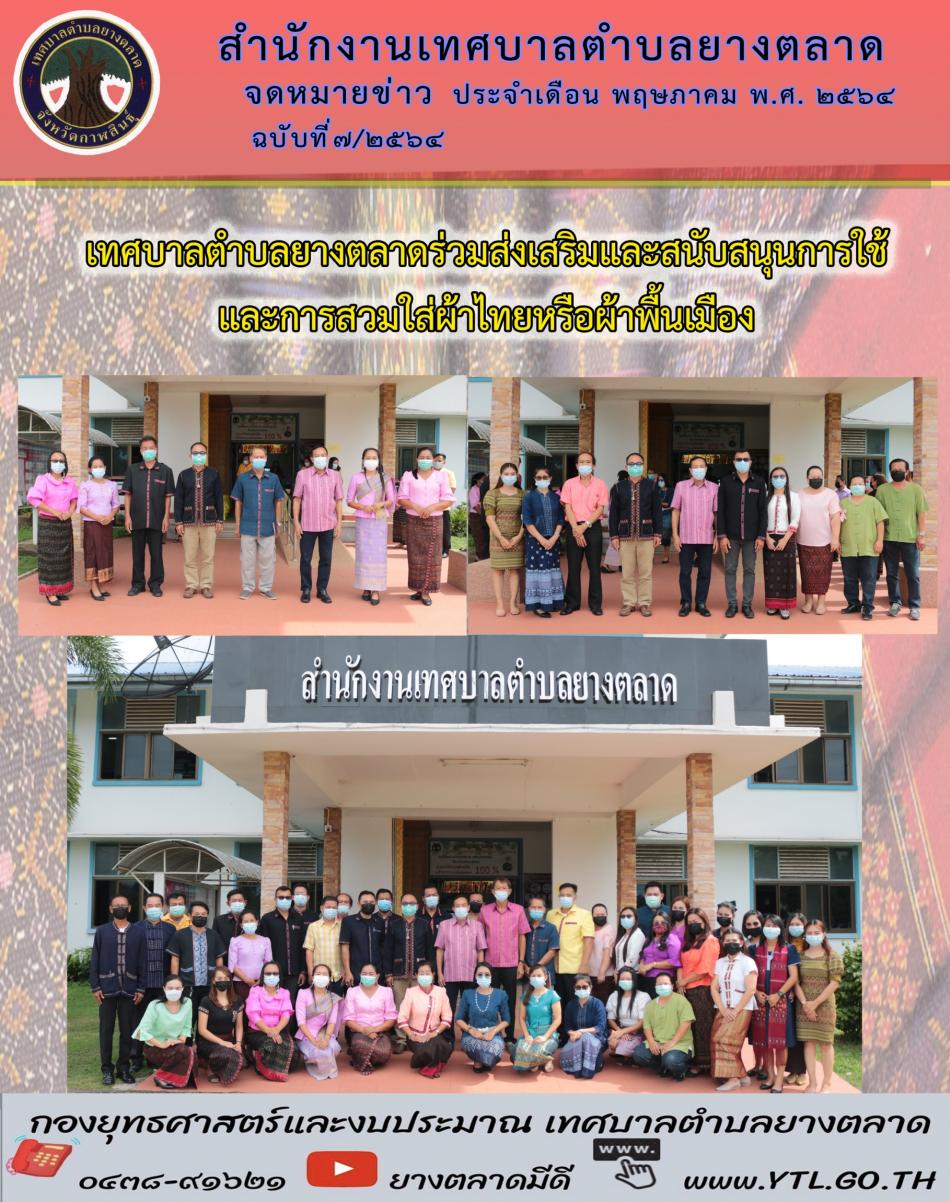 เทศบาลตำบลยางตลาดร่วมส่งเสริมและสนับสนุนการใช้และส่วมใส่ผ้าไทยหรือผ้าพื้นเมือง [29 มิถุนายน 2564]