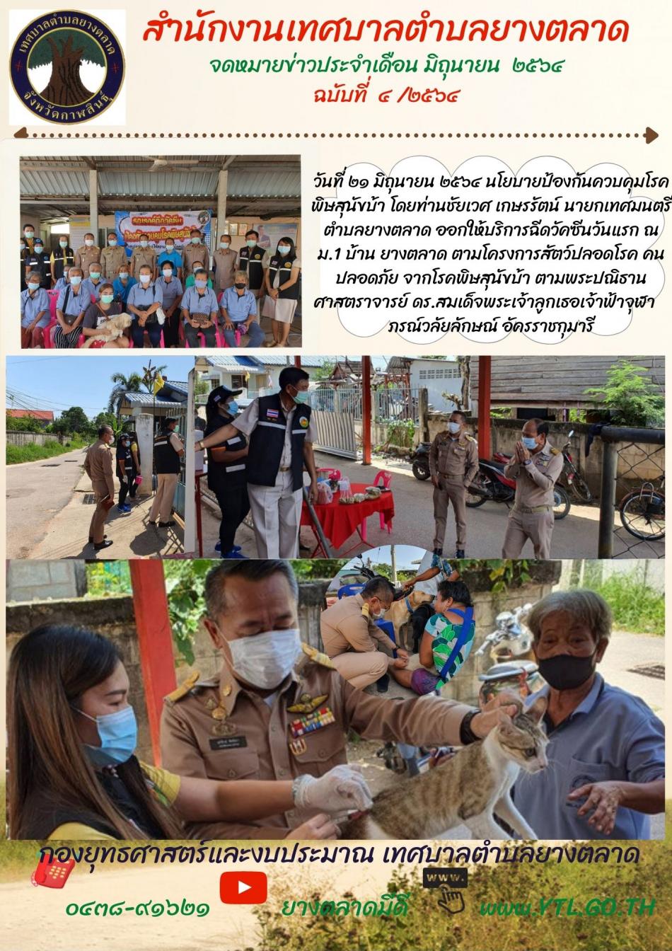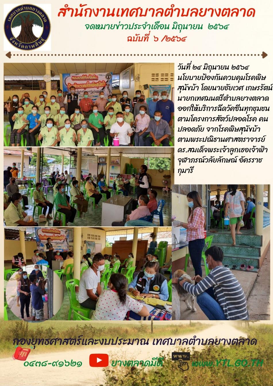 นายชัยเวศ เกษรรัตน์ นายกเทศมนตรีตำบลยางตลาด ออกให้บริการฉีดวัคซีน ตามโครงการสัตว์ปลอดโรค คนปลอดภัย จากโรคพิษสุนัขบ้า ตามพระปณิธานศาสตราจารย์ ดร.สมเด็จพระเจ้าลูกเธอเจ้าฟ้าจุฬาภรณ์วลัยลักษณ์ อัครราชกุมารี [21 มิถุนายน 2564]