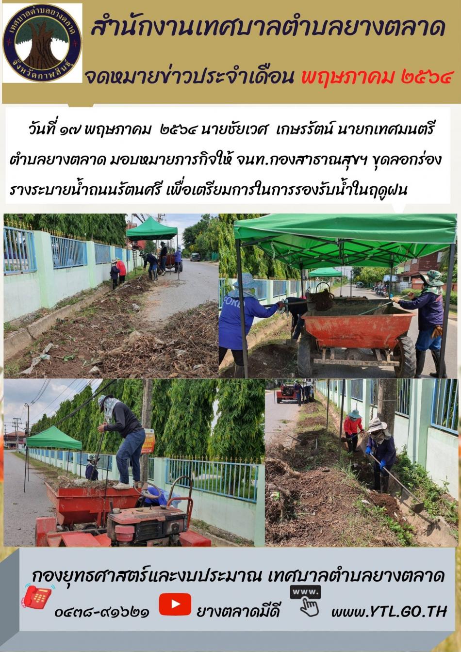 วันที่ 17 พฤษภาคม 2564 นายชัยเวศ เกษรรัตน์ นายกเทศมนตรีตำบลยางตลาด มอบหมายภารกิจให้ จนท.กองสาธารณสุขฯ ขุดลอกร่องรางระบายน้ำถนนรัตนศรี เพื่อเตรียมการในการรองรับน้ำในฤดูฝน [17 พฤษภาคม 2564]