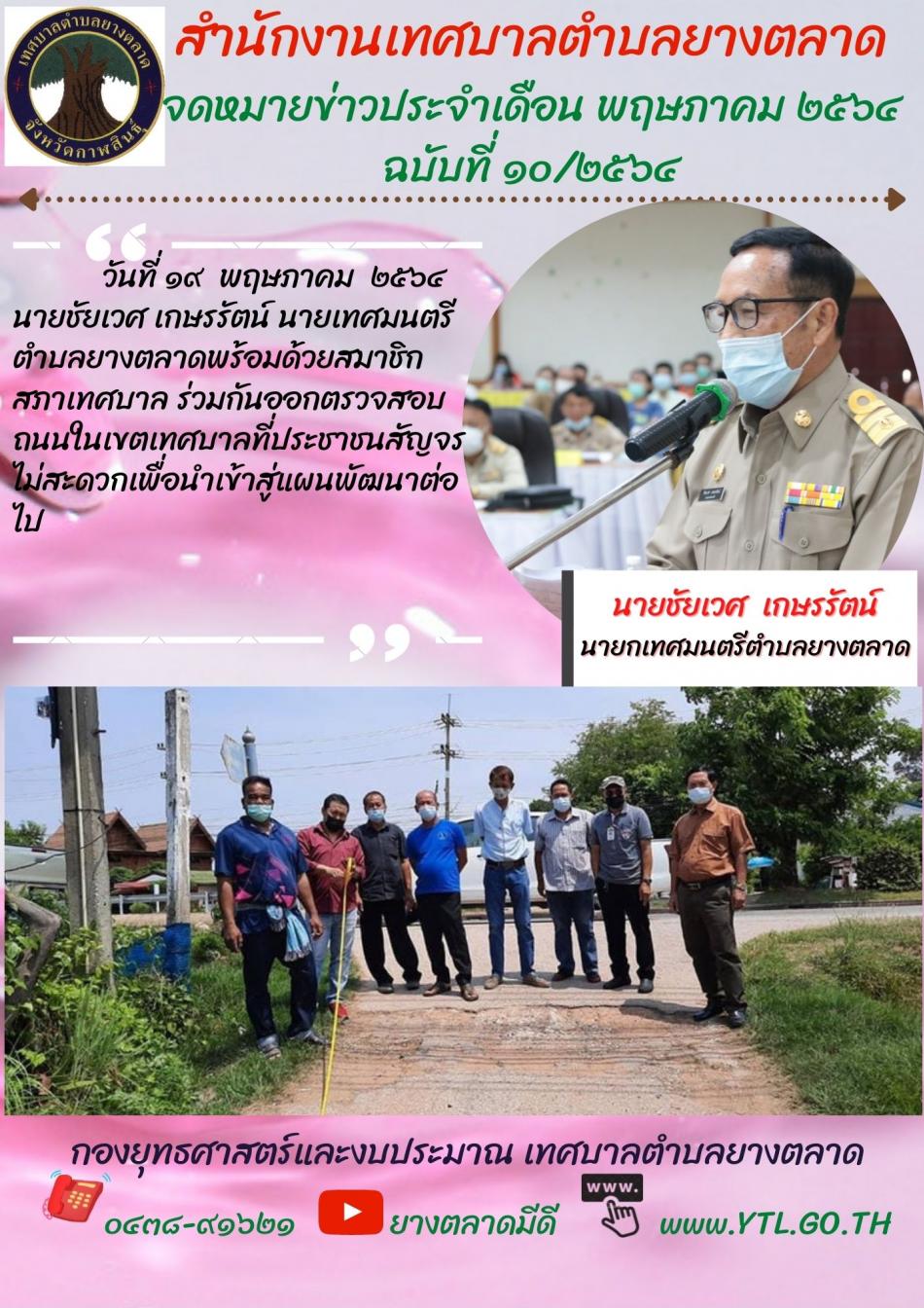 นายชัยเวศ เกษรรัตน์ นายกเทศมนตรีตำบลยางตลาด พร้อมด้วยสมาชิกสภาเทศบาล ร่วมกันออกตรวจสอบถนนในเขตเทศบาลฯ [19 พฤษภาคม 2564]