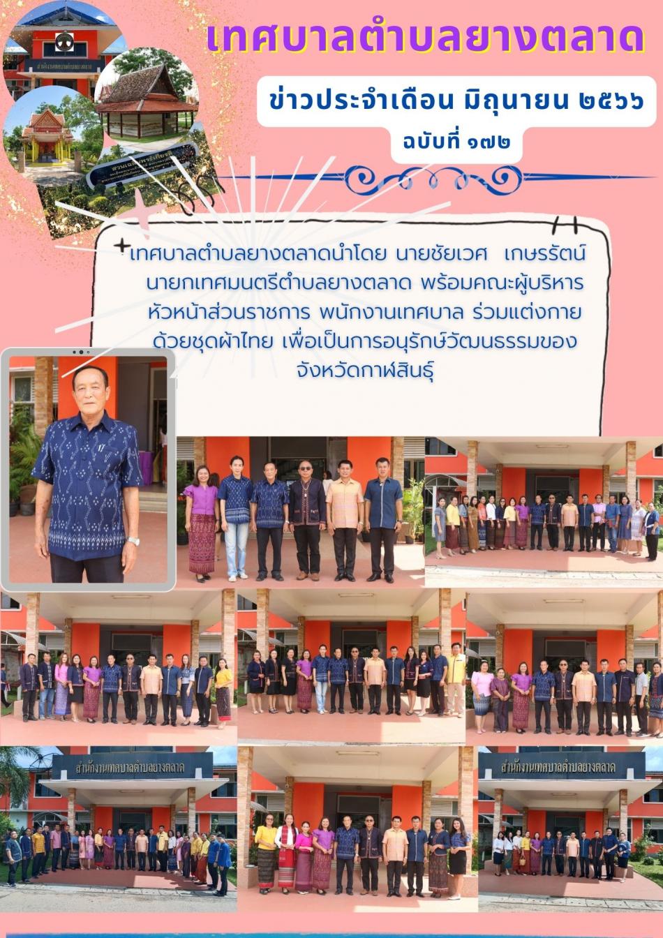 เทศบาลตำบลยางตลาดนำโดย นายชัยเวศ เกษรรัตน์ นายกเทศมนตรีตำบลยางตลาด พร้อมคณะผู้บริหาร หัวหน้าส่วนราชการ พนักงานเทศบาล ร่วมแต่งกายด้วยชุดผ้าไทย เพื่อเป็นการอนุรักษ์วัฒนธรรมของจังหวัดกาฬสินธุ์ [13 มิถุนายน 2566]