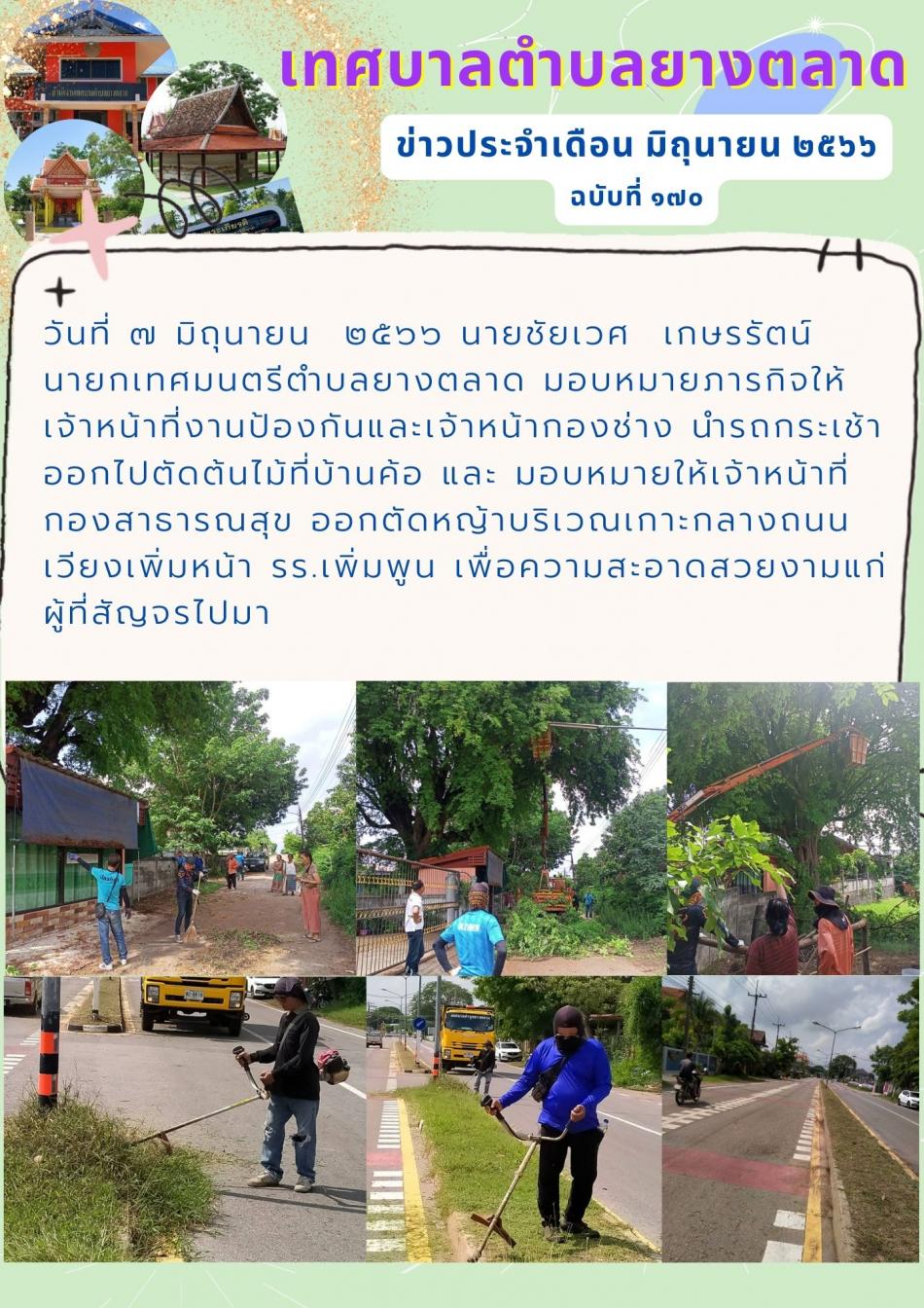 วันที่ ๖ มิถุนายน ๒๕๖๖ นายชัยเวศ เกษรรัตน์ นายกเทศมนตรีตำบลยางตลาด มอบหมายให้ เจ้าหน้ากองสาธารณสุขออกดายหญ้า ณ บริเวณเกาะกลางถนนถีนานนท์ เพื่อความสะอาดสวยงามแก่ผู้สัญจรไปมา [6 มิถุนายน 2566]
