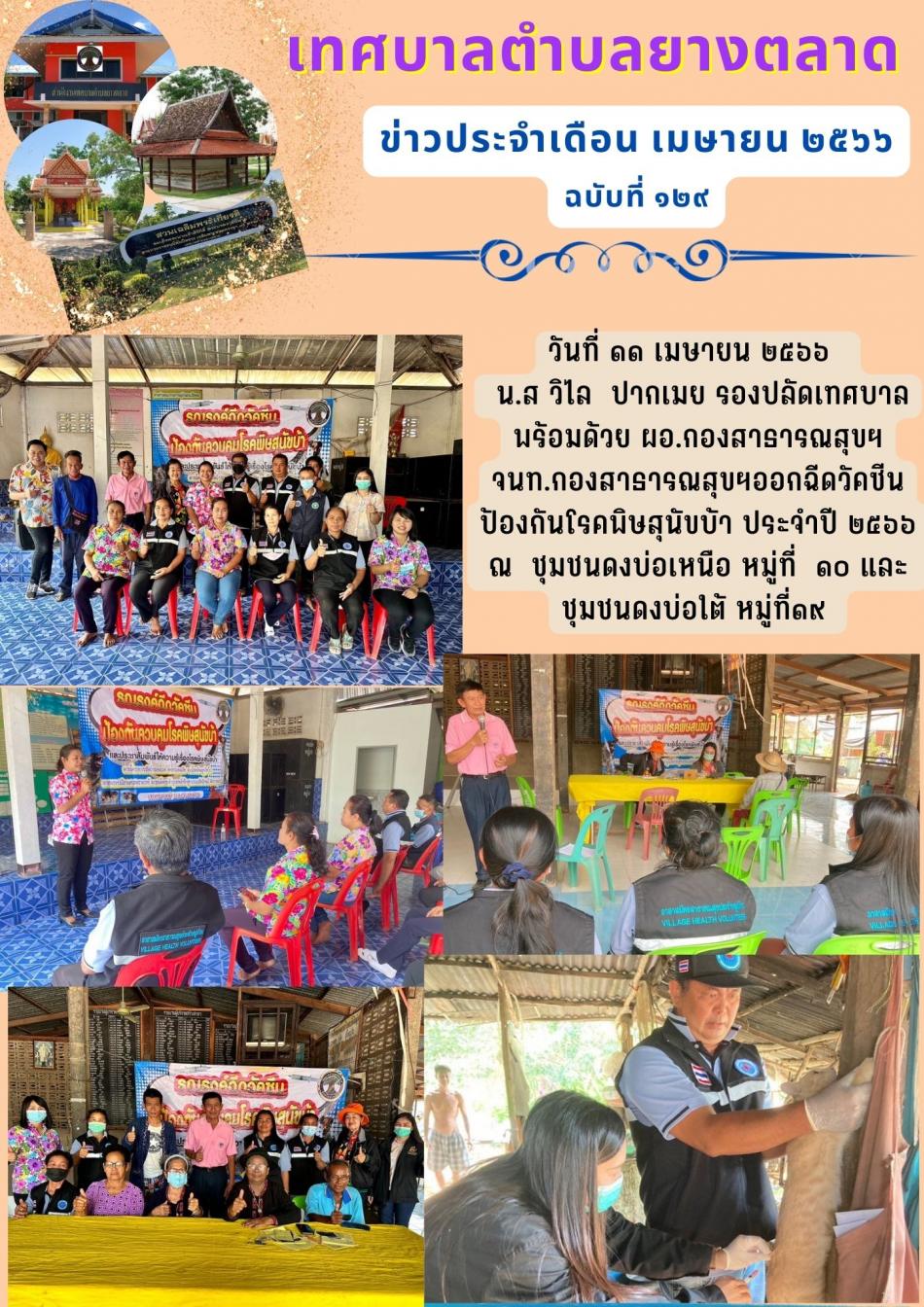 วันที่ ๔ เมษายน ๒๕๖๖ นายชัยเวศ เกษรรัตน์ นายกเทศมนตรีตำบลยางตลาด มอบหมายภารกิจให้นายแดนไทย โคตรยอด รองนายกฯพร้อมด้วย รองปลัดเทศบาล ผอ.กองสาธารณสุข และ จนท.กองสาธารณสุข ออกให้บริการฉีดวัคซีนสนุขและแมว... [4 เมษายน 2566]