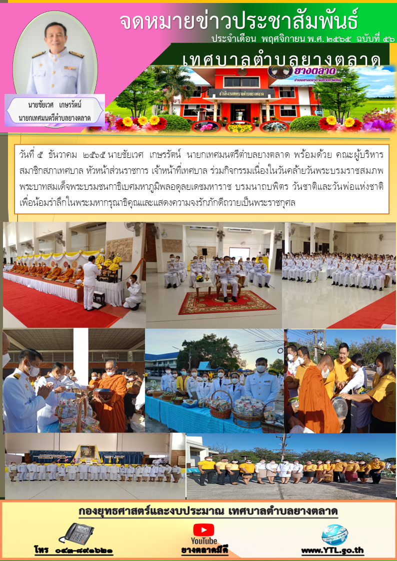 วันที่ ๕ ธันวาคม ๒๕๖๕ นายชัยเวศ เกษรรัตน์ นายกเทศมนตรีตำบลยางตลาด พร้อมด้วย คณะผู้บริหาร สมาชิกสภาเทศบาล หัวหน้าส่วนราชการ เจ้าหน้าที่เทศบาล ร่วมกิจกรรมเนื่องในวันคล้ายวันพระบรมราชสมภพ... [5 ธันวาคม 2565]