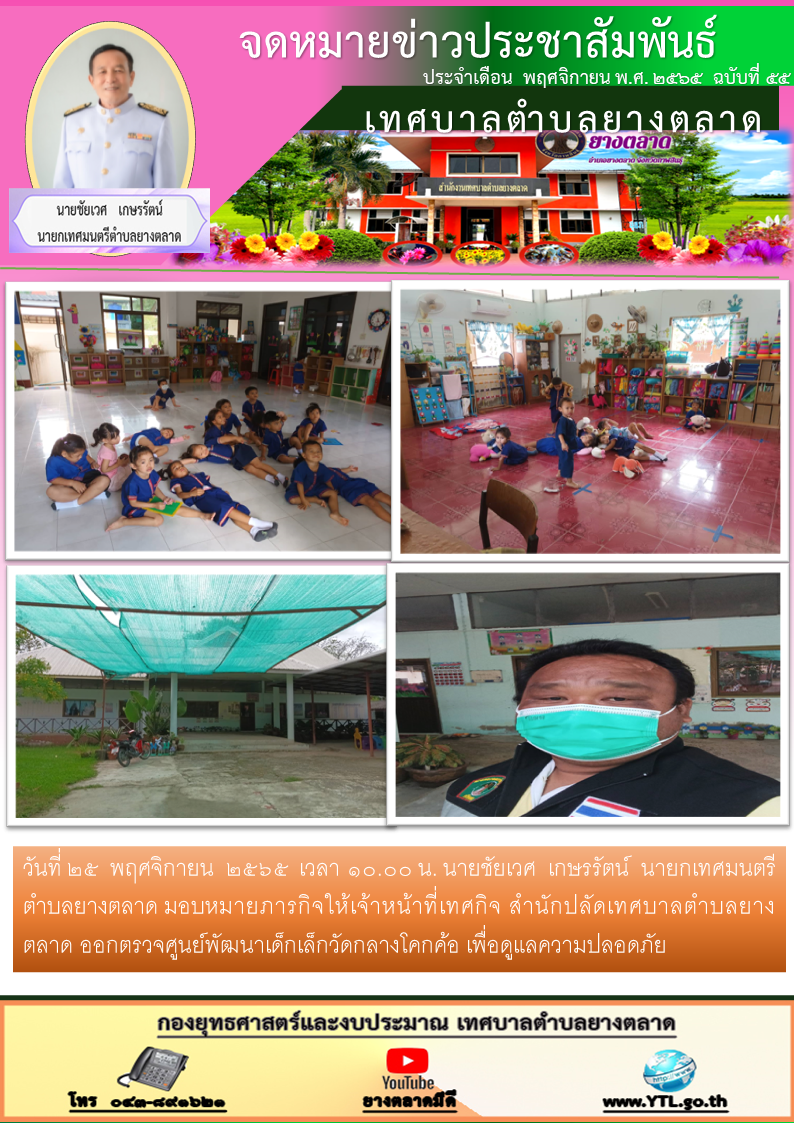 วันที่ ๒๕ พฤศจิกายน ๒๕๖๕ เวลา ๑๐.๐๐ น. นายชัยเวศ เกษรรัตน์ นายกเทศมนตรีตำบลยางตลาด มอบหมายภารกิจให้เจ้าหน้าที่เทศกิจ สำนักปลัดเทศบาลตำบลยางตลาด ออกตรวจศูนย์พัฒนาเด็กเล็กวัดกลางโคกค้อ เพื่อดูแลความปลอดภัย [25 พฤศจิกายน 2565]
