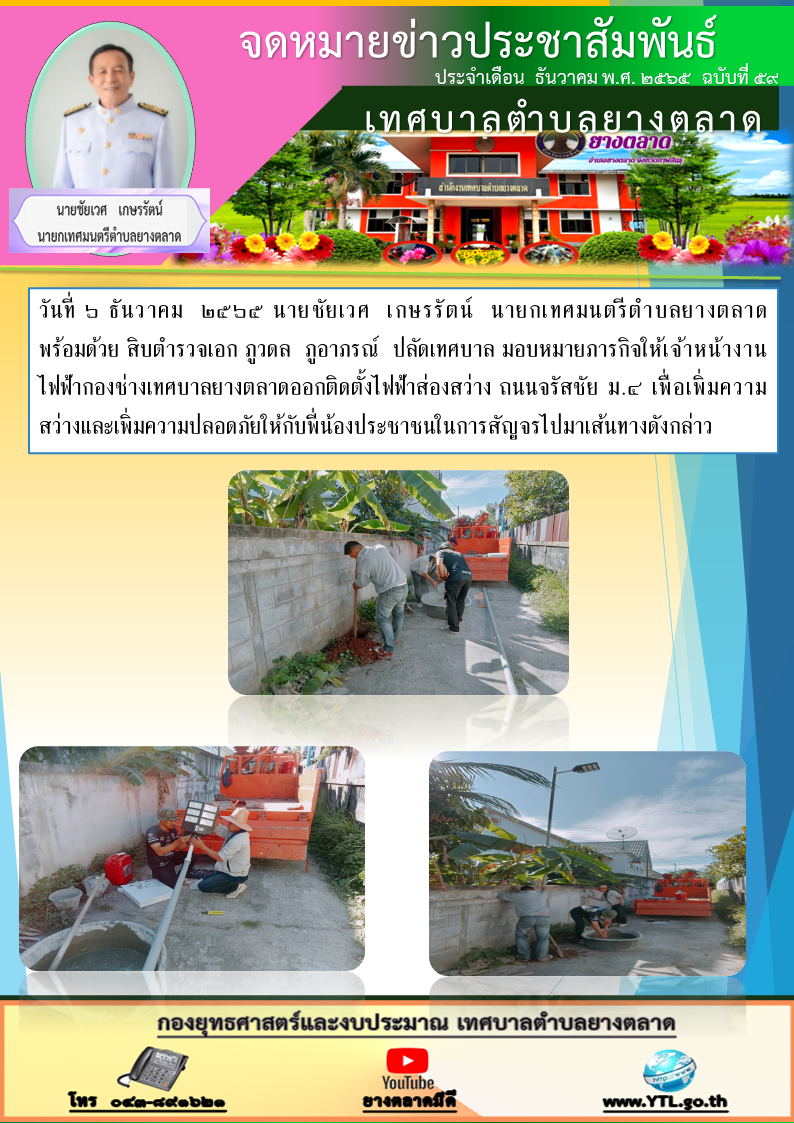 วันที่ ๖ ธันวาคม ๒๕๖๕ นายชัยเวศ เกษรรัตน์ นายกเทศมนตรีตำบลยางตลาด พร้อมด้วย สิบตำรวจเอก ภูวดล ภูอาภรณ์ ปลัดเทศบาล มอบหมายภารกิจให้เจ้าหน้างานไฟฟ้ากองช่างเทศบาลยางตลาดออกติดตั้งไฟฟ้าส่องสว่าง ถนนจรัสชัย ม.๔... [6 ธันวาคม 2565]