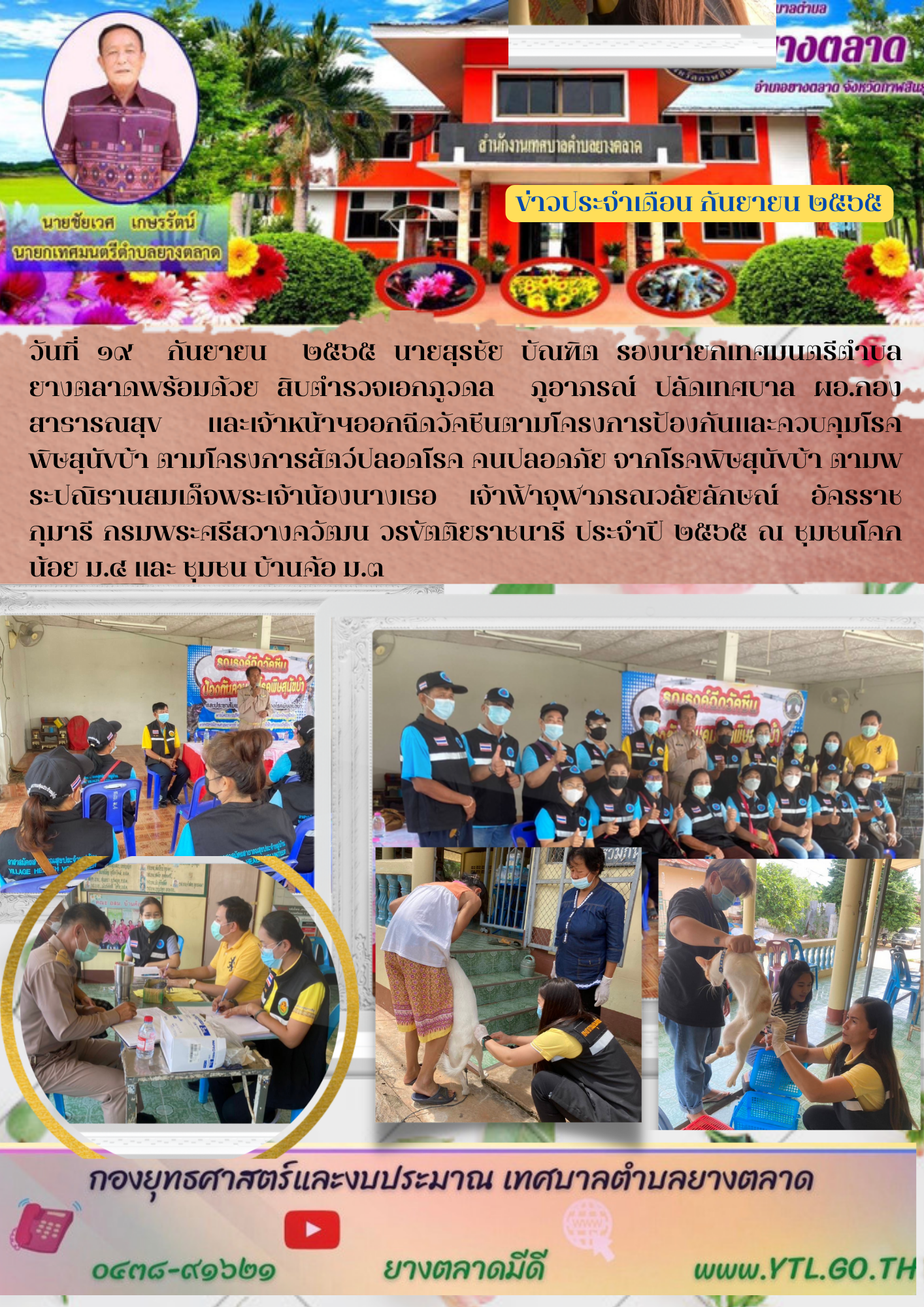 วันที่ ๑๙ กันยายน ๒๕๖๕ นายสุรชัย บัณฑิต รองนายกเทศมนตรีตำบลยางตลาดพร้อมด้วย สิบตำรวจเอกภูวดล ภูอาภรณ์ ปลัดเทศบาล ผอ.กองสาธารณสุข และเจ้าหน้าฯออกฉีดวัคชีนตามโครงการป้องกันและควบคุมโรคพิษสุนัขบ้า... [19 กันยายน 2565]