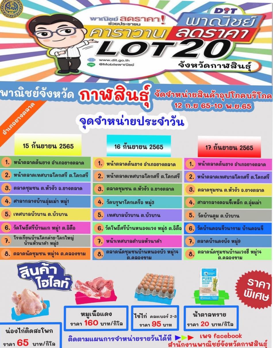 วันที่ 16 กันยายน 2565 เทศบาลตำบลยางตลาดขอประชาสัมพันธ์เชิญชวนพี่น้องประชาชนออกมาเลือกชม เลือกชื้อสินค้าธงฟ้า ราคาประหยัด กับโครงการพาณิชย์…ลดราคา!ช่วยประชาชน Lot20 จังหวัดกาฬสินธุ์ ตามนโยบาย ... [15 กันยายน 2565]