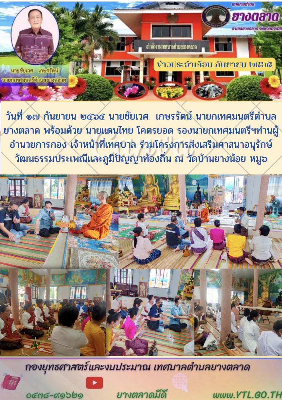วันที่ ๑๗ กันยายน ๒๕๖๕ นายชัยเวศ เกษรรัตน์ นายกเทศมนตรีตำบลยางตลาด พร้อมด้วย นายแดนไทย โคตรยอด รองนายกเทศมนตรีฯท่านผู้อำนวยการกอง เจ้าหน้าที่เทศบาล... [17 กันยายน 2565]