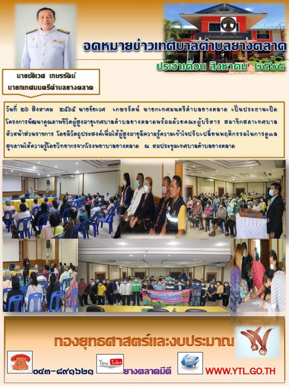 วันที่ ๒๖ สิงหาคม ๒๕๖๕ นายชัยเวศ เกษรรัตน์ นายกเทศมนตรีตำบลยางตลาด เป็นประธานเปิดโครงการพัฒนาคุณภาพชีวิตผู้สูงอายุเทศบาลตำบลยางตลาดพร้อมด้วยคณะผู้บริหาร สมาชิกสภาเทศบาล หัวหน้าส่วนราชการ... [26 สิงหาคม 2565]