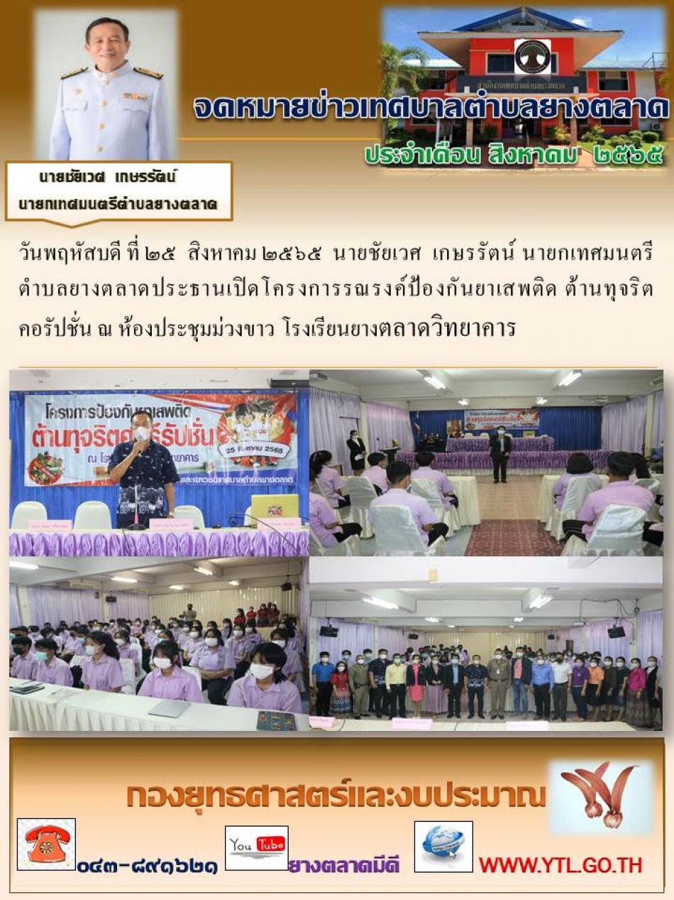 วันพฤหัสบดี ที่ ๒๕ สิงหาคม ๒๕๖๕ นายชัยเวศ เกษรรัตน์ นายกเทศมนตรีตำบลยางตลาดประธานเปิดโครงการรณรงค์ป้องกันยาเสพติด ต้านทุจริตคอรัปชั่น ณ ห้องประชุมม่วงขาว โรงเรียนยางตลาดวิทยาคาร [25 สิงหาคม 2565]