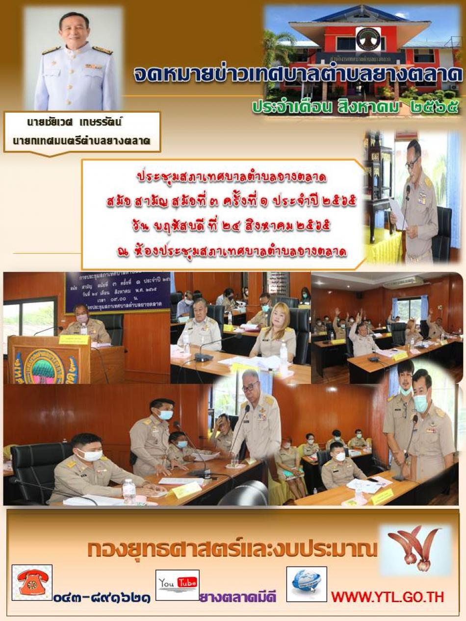 ประชุมสภาเทศบาลตำบลยางตลาด สมัย สามัญ สมัยที่ ๓ ครั้งที่ ๑ ประจำปี ๒๕๖๕ วัน พฤหัสบดี ที่ ๒๔ สิงหาคม ๒๕๖๕ ณ ห้องประชุมสภาเทศบาลตำบลยางตลาด [24 สิงหาคม 2565]