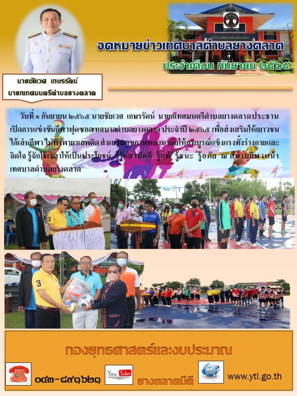 วันที่ ๑ กันยายน ๒๕๖๕ นายชัยเวศ เกษรรัตน์ นายกเทศมนตรีตำบลยางตลาดประธานเปิดการแข่งขันกีฬาฟุตซอลเทศบาลตำบลยางตลาด ประจำปี ๒๕๖๕ เพื่อส่งเสริมให้เยาวชนได้เล่นกีฬา ไม่พึ่งพายาเสพติด... [1 กันยายน 2565]