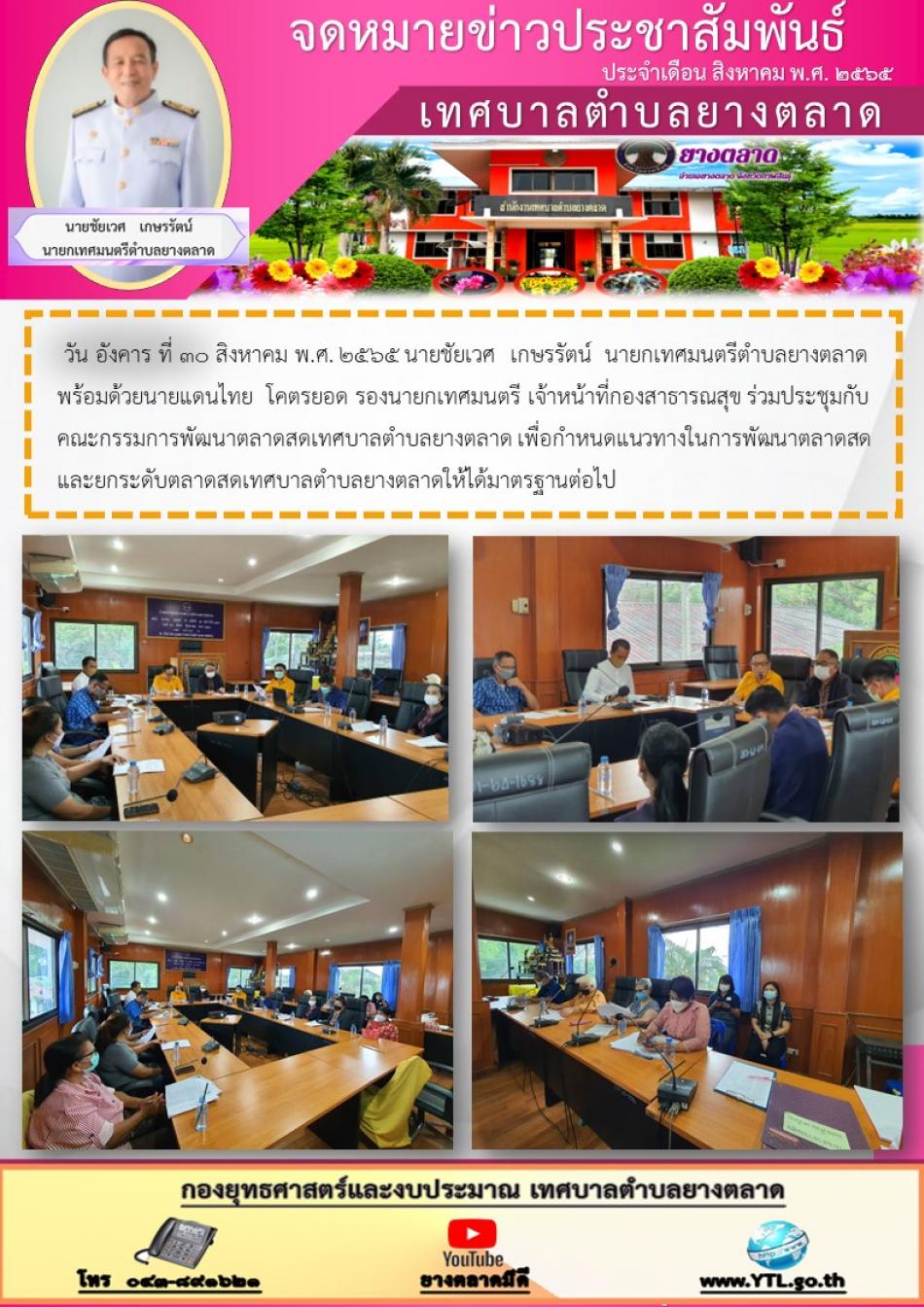 วัน อังคาร ที่ 30 สิงหาคม พ.ศ. 2565 นายชัยเวศ เกษรรัตน์ นายกเทศมนตรีตำบลยางตลาด พร้อมด้วยนายแดนไทย โคตรยอด รองนายกเทศมนตรี เจ้าหน้าที่กองสาธารณสุข ร่วมประชุมกับคณะกรรมการพัฒนาตลาดสดเทศบาลตำบลยางตลาด... [30 สิงหาคม 2565]