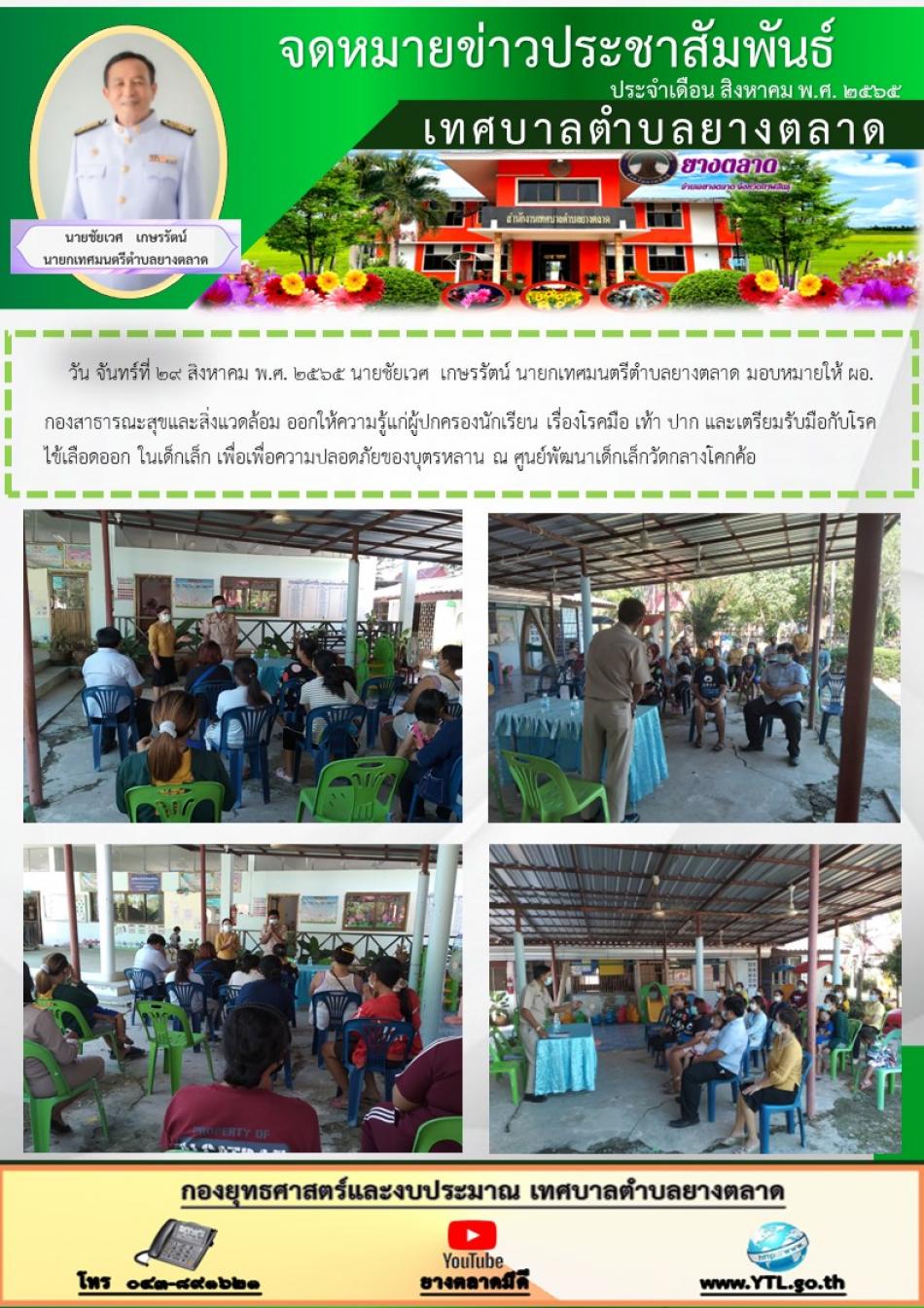 วันจันทร์ที่ 29 สิงหาคม พ.ศ. 2565 ท่านนายกชัยเวศ เกษรรัตน์ นายกเทศมนตรีตำบลยางตลาด มอบหมายให้ ผอ.กองสาธารณะสุขและสิ่งแวดล้อม ออกให้ความรู้แก่ผู้ปกครองนักเรียนเรื่องโรคมือ เท้า ปาก และเตรียมรับมือกับโรคไข้เลือดออก... [29 สิงหาคม 2565]