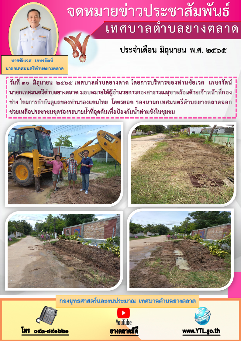 วันที่ ๓๐ มิถุนายน ๒๕๖๕ เทศบาลตำบลยางตาด โดยการบริหารของท่านชัยเวศ เกษรรัตน์ นายกเทศมนตรีตำบลยางตลาด มอบหมายให้ผู้อำนวยการกองสาธารณสุขฯพร้อมด้วยเจ้าหน้าที่กองช่าง โดยการกำกับดูแลของท่านรองแดนไทย โคตรยอด... [30 มิถุนายน 2565]