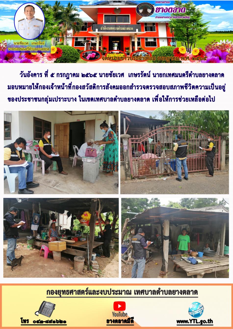กองสวัสดิการสังคมออกสำรวจตรวจสอบสภาพชีวิตความเป็นอยู่ของประชาชนปลุ่มเปราะบางในเขตเทศบาลตำบลยางตลาด [5 กรกฎาคม 2565]