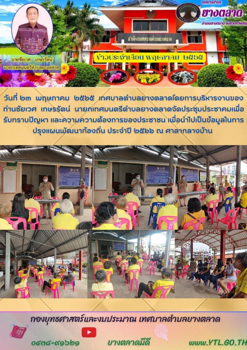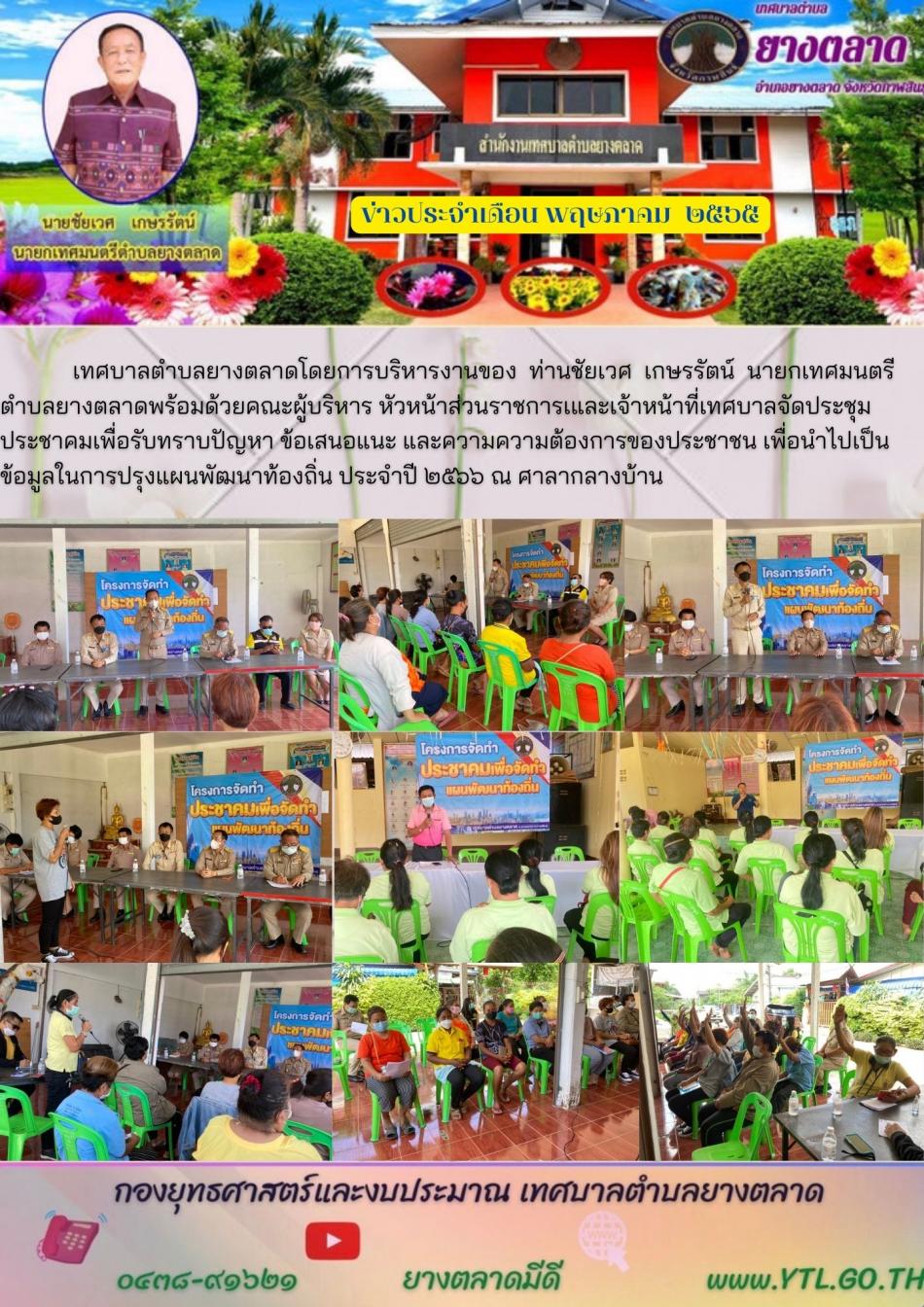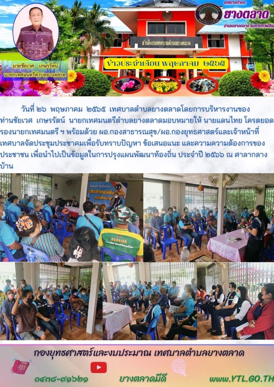 เทศบาลตำบลยางตลาดโดยการบริหารงานของ ท่านชัยเวศ เกษรรัตน์ นายกเทศมนตรีตำบลยางตลาดพร้อมด้วยคณะผู้บริหาร หัวหน้าส่วนราชการเและเจ้าหน้าที่เทศบาลจัดประชุมประชาคมเพื่อรับทราบปัญหา ข้อเสนอแนะ... [31 พฤษภาคม 2565]