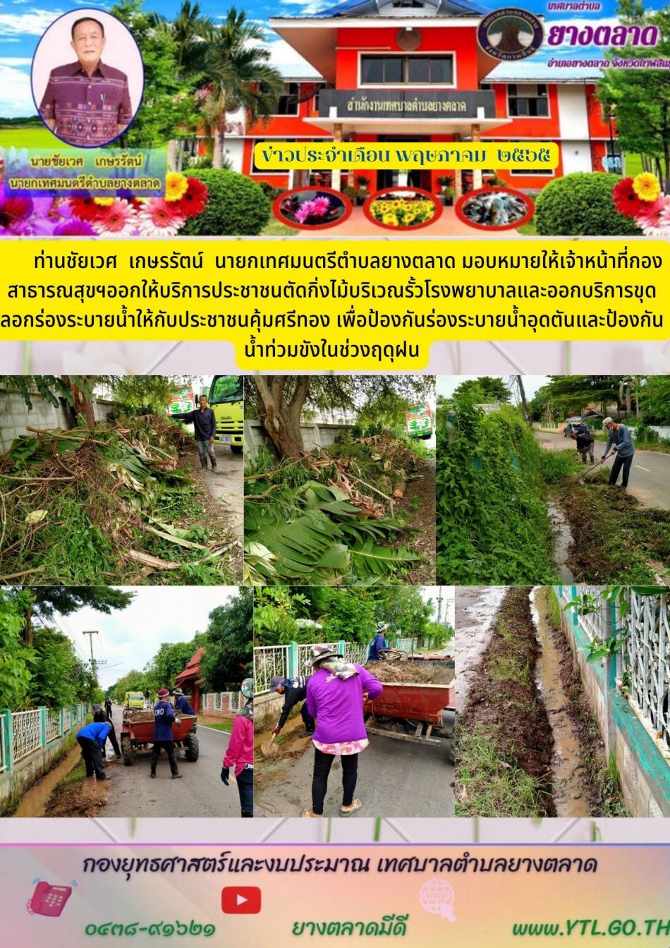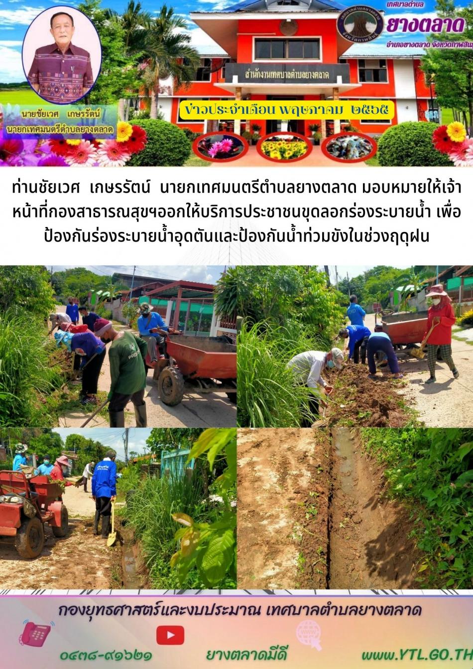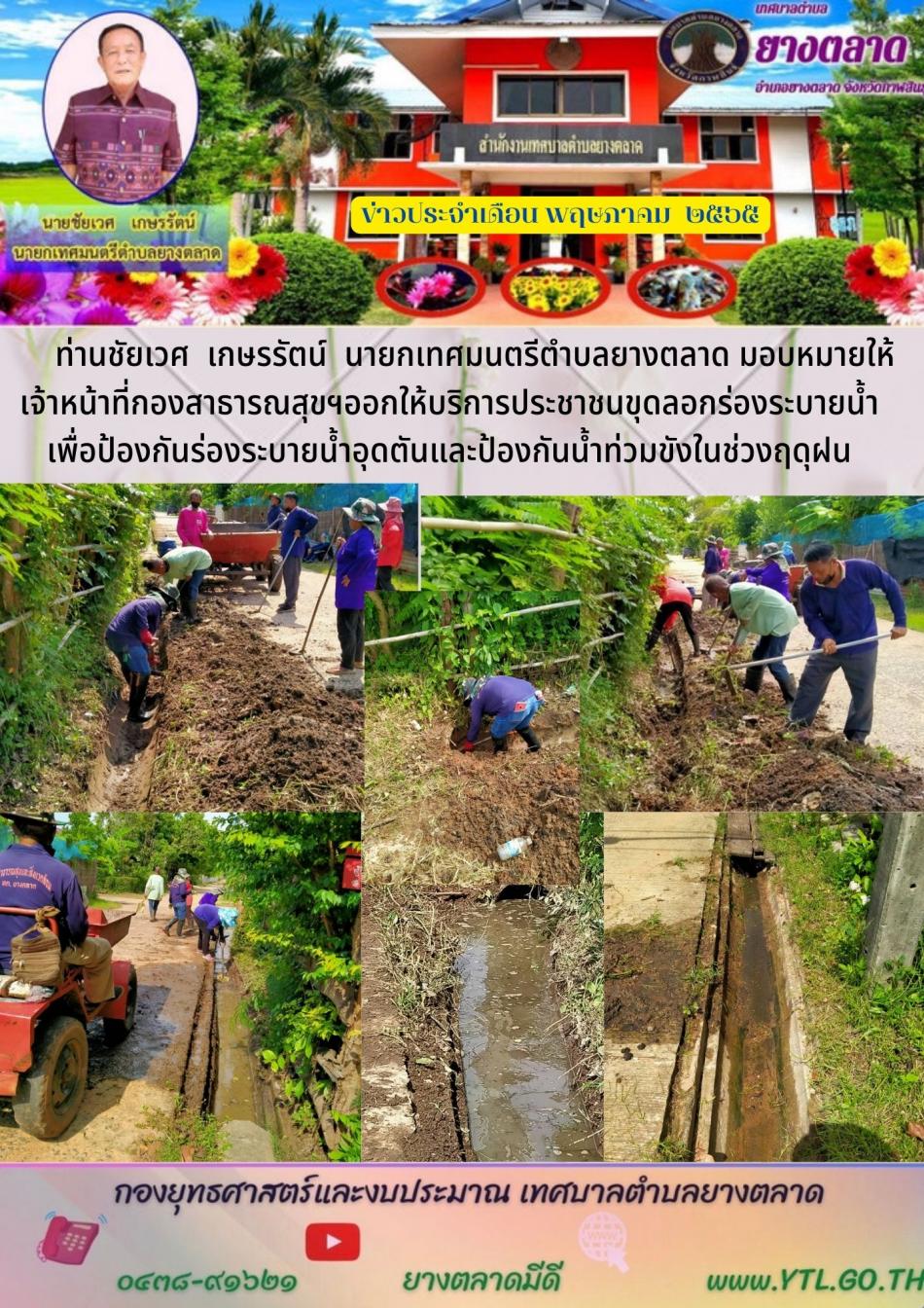 ท่านชัยเวศ เกษรรัตน์ นายกเทศมนตรีตำบลยางตลาด มอบหมายให้เจ้าหน้าที่กองสาธารณสุขฯออกให้บริการประชาชนขุดลอกร่องระบายน้ำ เพื่อป้องกันร่องระบายน้ำอุดตันและป้องกันน้ำท่วมขังในช่วงฤดุฝน [26 พฤษภาคม 2565]