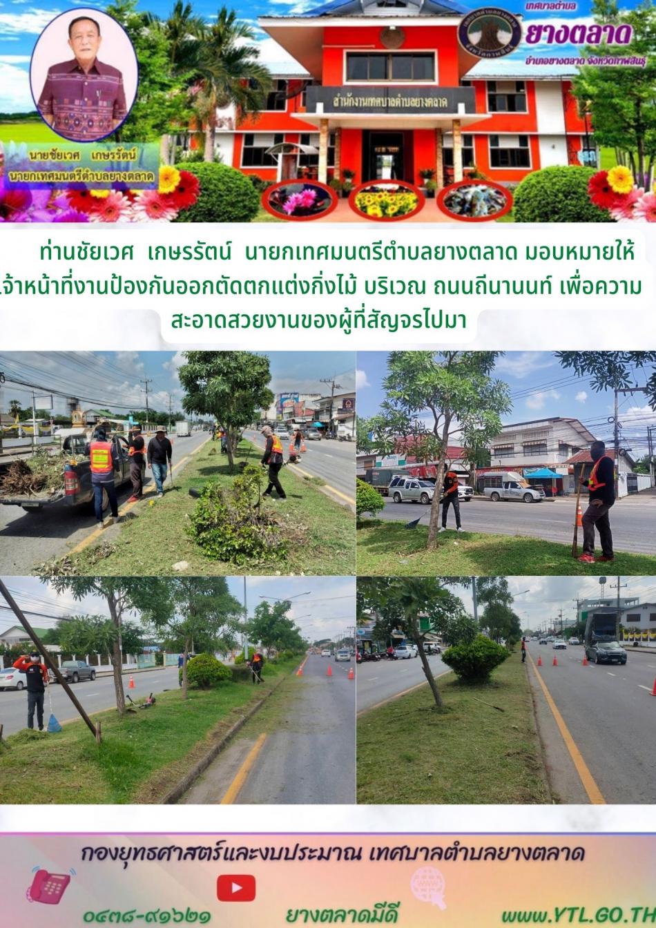ท่านชัยเวศ เกษรรัตน์ นายกเทศมนตรีตำบลยางตลาด มอบหมายให้เจ้าหน้าที่งานป้องกันออกตัดตกแต่งกิ่งไม้ บริเวณ ถนนถีนานนท์ เพื่อความสะอาดสวยงานของผู้ที่สัญจรไปมา [30 พฤษภาคม 2565]