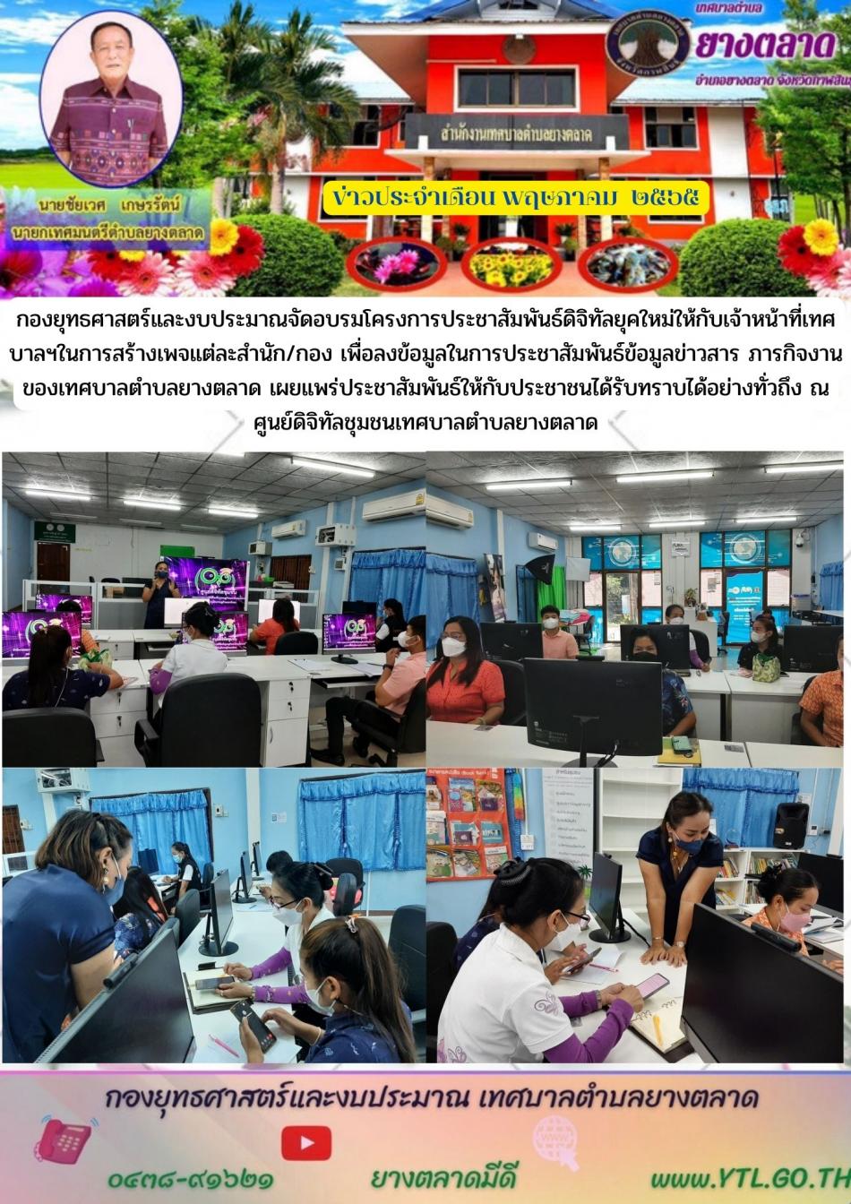 กองยุทธศาสตร์และงบประมาณจัดอบรมโครงการประชาสัมพันธ์ดิจิทัลยุคใหม่ให้กับเจ้าหน้าที่เทศบาลฯในการสร้างเพจแต่ละสำนัก/กอง เพื่อลงข้อมูลในการประชาสัมพันธ์ข้อมูลข่าวสาร ภารกิจงานของเทศบาลตำบลยางตลาด... [26 พฤษภาคม 2565]