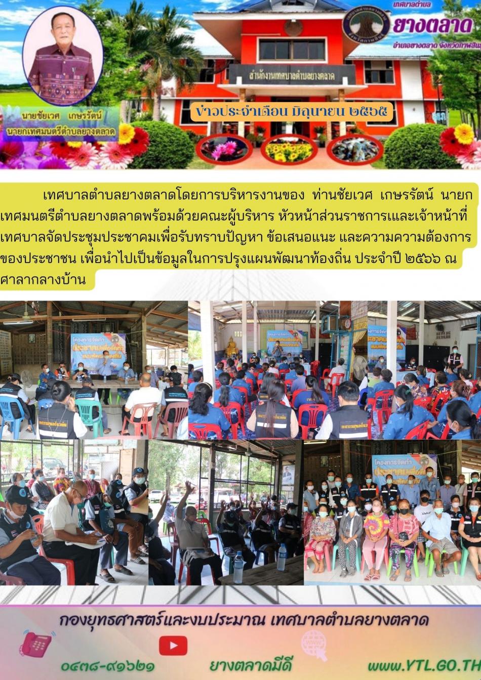 เทศบาลตำบลยางตลาดโดยการบริหารงานของ ท่านชัยเวศ เกษรรัตน์ นายกเทศมนตรีตำบลยางตลาดพร้อมด้วยคณะผู้บริหาร หัวหน้าส่วนราชการเและเจ้าหน้าที่เทศบาลจัดประชุมประชาคมเพื่อรับทราบปัญหา ข้อเสนอแนะ... [2 มิถุนายน 2565]