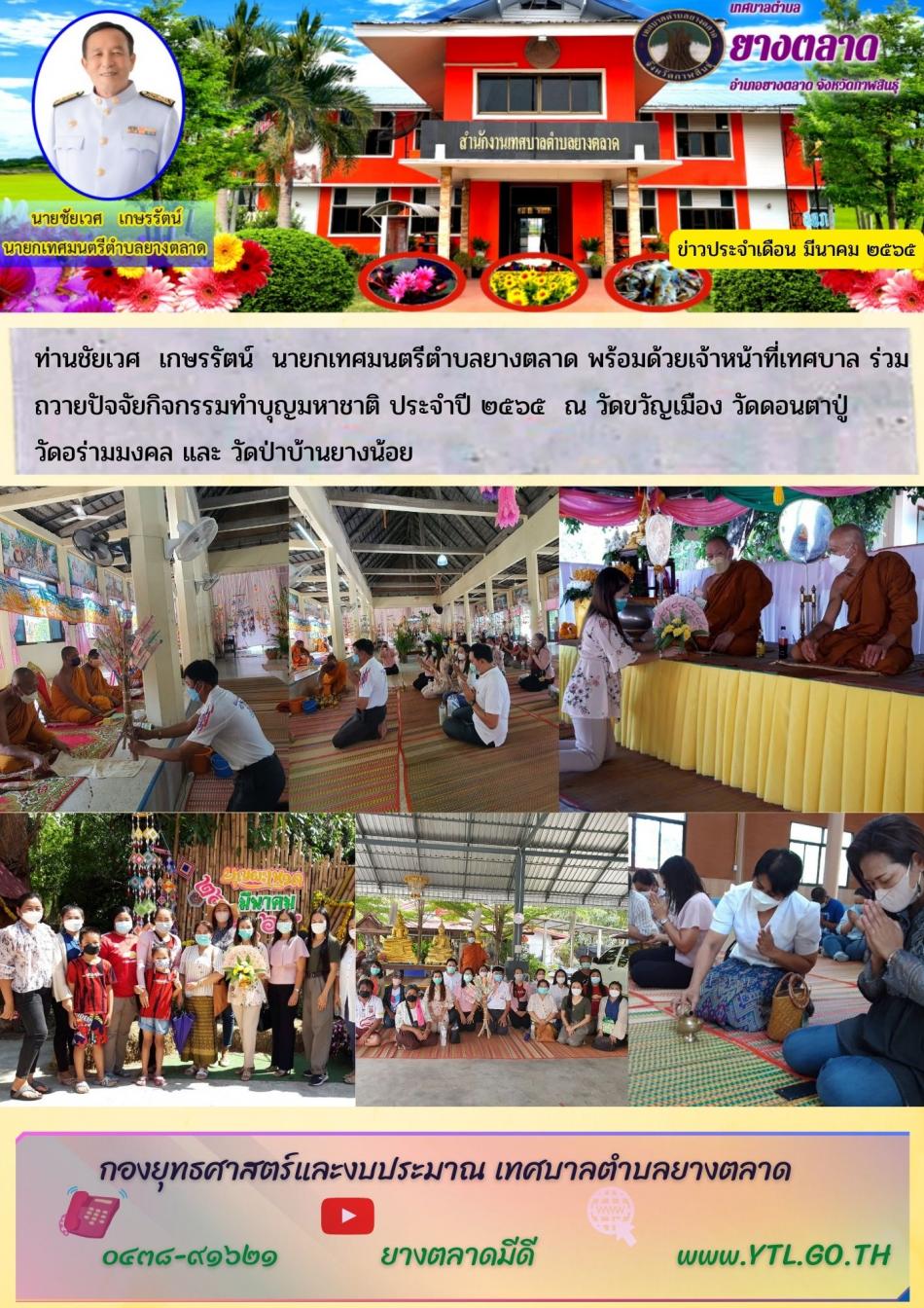 ท่านชัยเวศ เกษรรัตน์ นายกเทศมนตรีตำบลยางตลาด พร้อมด้วยเจ้าหน้าที่เทศบาล ร่วมถวายปัจจัยกิจกรรมทำบุญมหาชาติ ประจำปี ๒๕๖๕ ณ วัดขวัญเมือง วัดดอนตาปู่ วัดอร่ามมงคล และ วัดป่าบ้านยางน้อย [28 มีนาคม 2565]