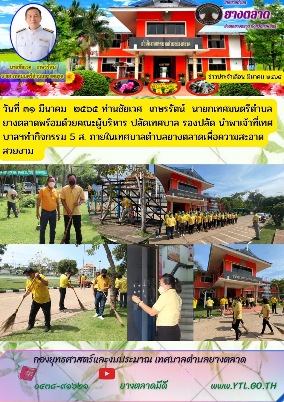 วันที่ ๓๑ มีนาคม ๒๕๖๕ ท่านชัยเวศ เกษรรัตน์ นายกเทศมนตรีตำบลยางตลาดพร้อมด้วยคณะผู้บริหาร ปลัดเทศบาล รองปลัด นำพาเจ้าที่เทศบาลฯทำกิจกรรม 5 ส. ภายในเทศบาลตำบลยางตลาดเพื่อความสะอาดสวยงาม [31 มีนาคม 2565]